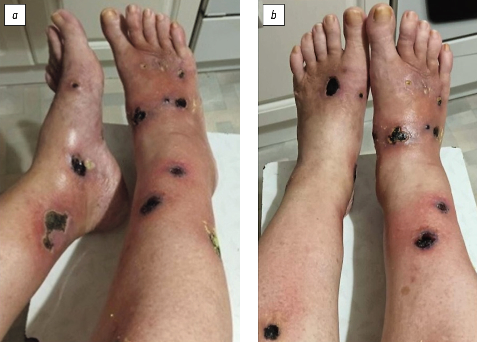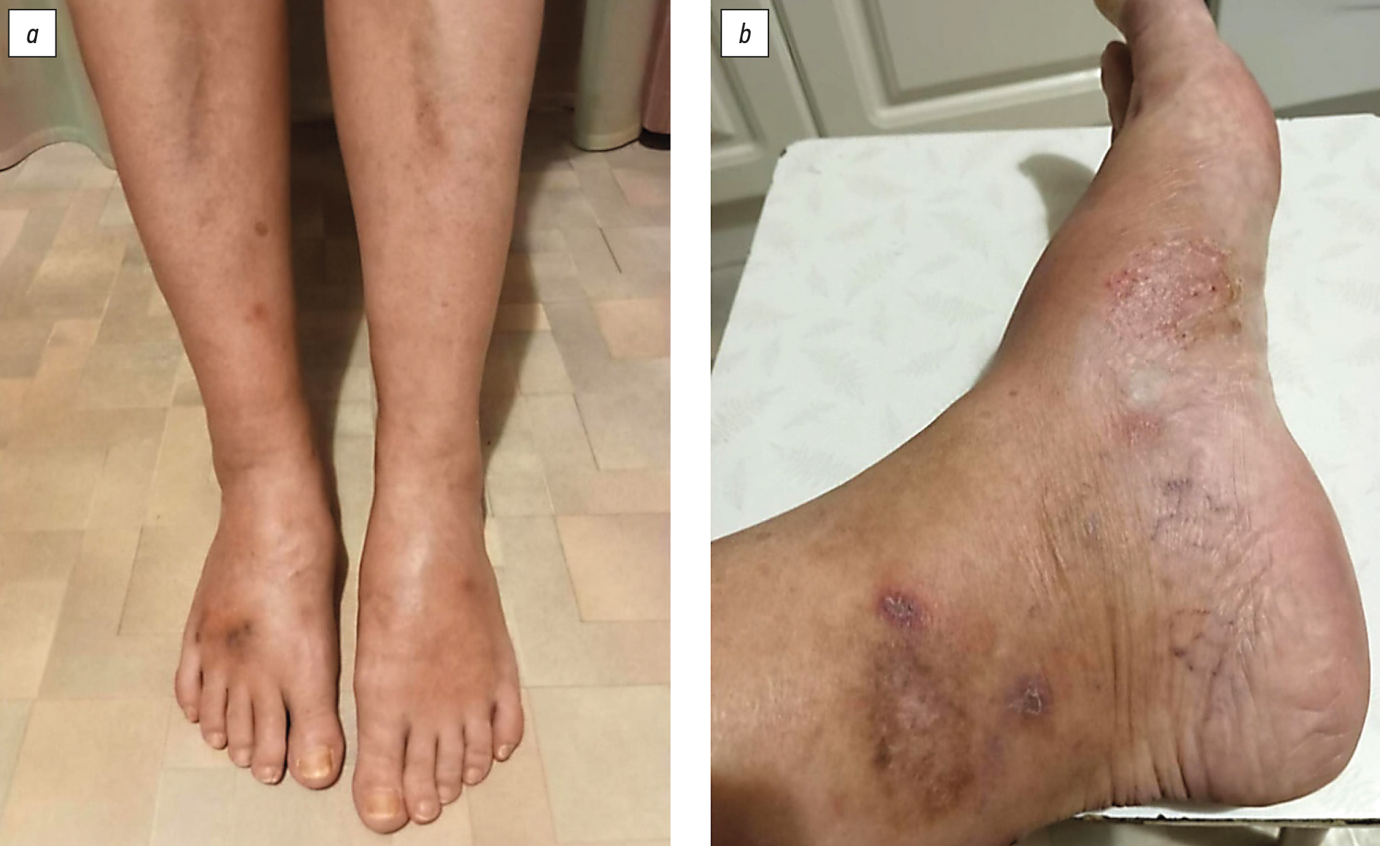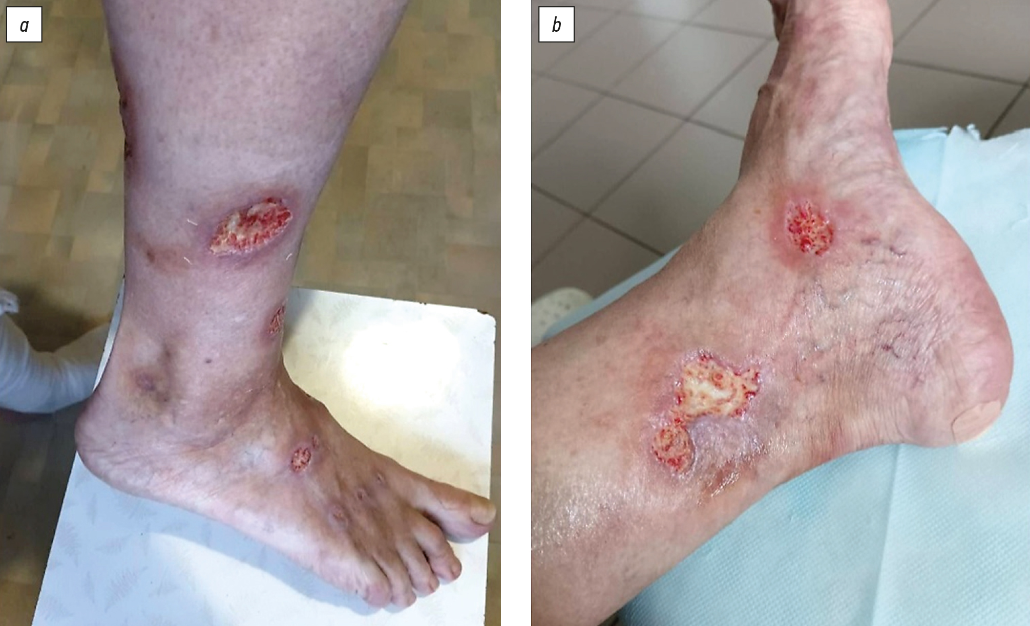Fig. 1. Ulcerative cutaneous defects with undermined borders and surrounding erythema revealed at patient’s admission to our clinic in 2023 on the left medial ankle (a) and both of her shins, dorsal surfaces of the feet (a, b). From the archive of the V.A. Rakhmanov Clinic of Skin and Venereal Diseases, 2025. The photograph is published for the first time.