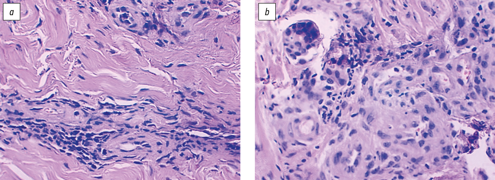 Fig. 2. On the histological examination of patient’s skin in the dermis neutrophil infiltrates and features of vasculitis were revealed. Hematoxylin and eosin stain ×250 (a), hematoxylin and eosin stain ×400 (b). From the archive of the V.A. Rakhmanov Clinic of Skin and Venereal Diseases, 2025. The photograph is published for the first time.