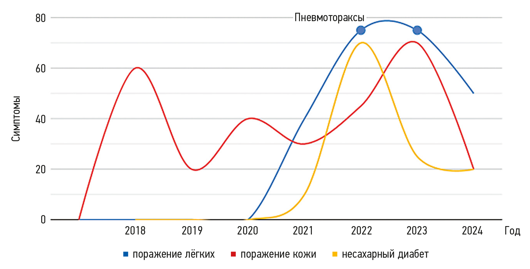 Рис. 1. График последовательности появления симптомов (кожные поражения были первым симптомом, появившимся в 2018 году, однако диагноз был установлен только в сентябре 2023 года). Из архива кафедры кожных и венерических болезней им. В.А. Рахманова, зав. Олисова О.Ю., 2025; публикуется впервые.