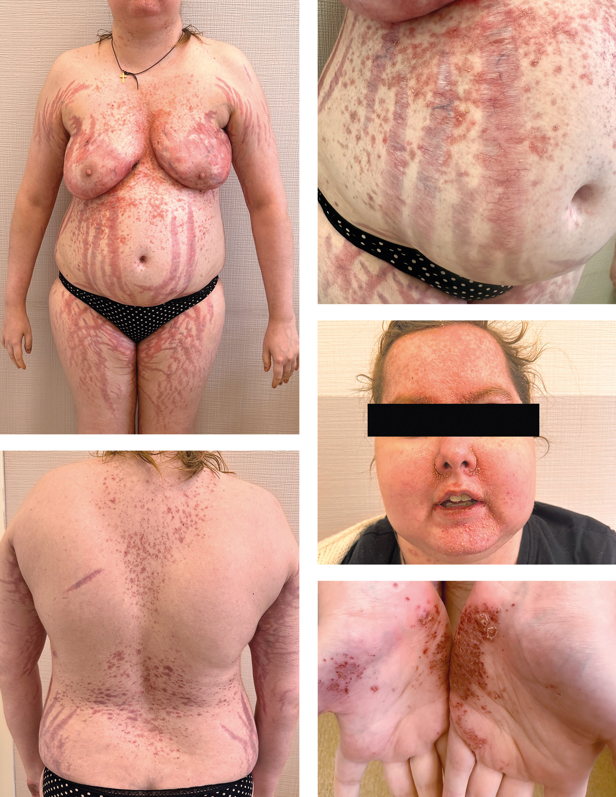 Локальный статус. Кожный процесс хронического воспалительного характера. На коже лица, туловища, верхних и нижних конечностей наблюдаются множественные папулёзные и единичные пустулёзные элементы с плотно прилегающими серозными корками. Папулы размером 2–3 мм, розового цвета, округлых форм, полушаровидные, склонны к группировке. На коже груди, живота и конечностей видны множественные стрии длиной до 30 см, синюшно-розового цвета. В субмаммарной области справа на фоне эритемы визуализируются две эрозии диаметром 1 см и 4 см, слева ― две эрозии по 1 см (рис. 2). Ногтевые пластины изменены, с багрово-коричневыми вкраплениями.