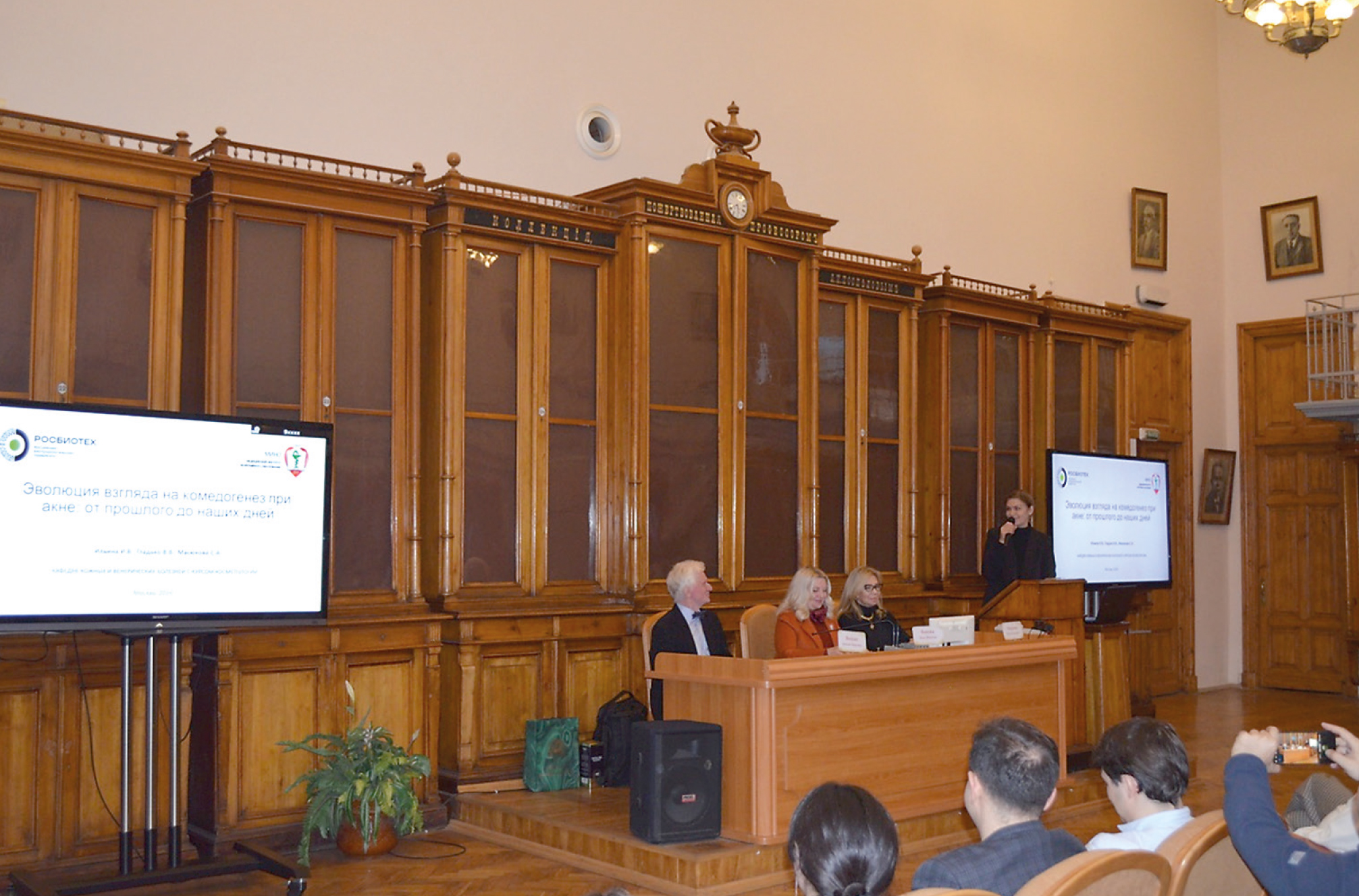 Доклад об эволюции взглядов на комедоногенез при акне представили доцент И.В. Ильина, профессор В.В. Гладько и профессор С.А. Масюкова (Медицинский институт непрерывного образования «Росбиотех»).