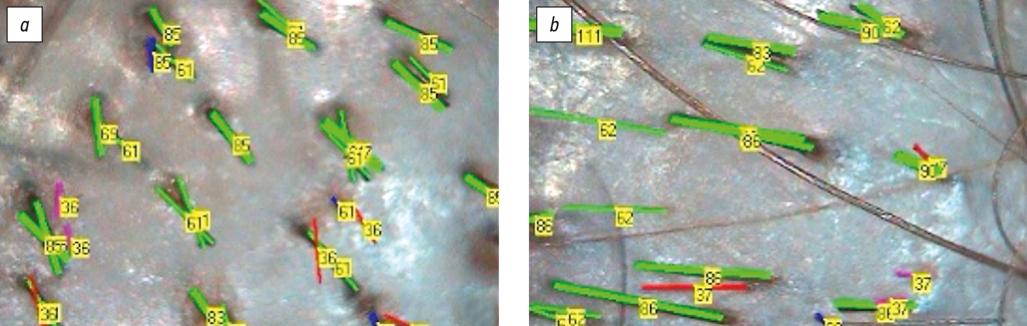 Fig. 2. Trichoscopy of parietal (a) and occipital (b) region of patient G. after treatment, ×60. [Photo from the archive of the I.M. Sechenov First Moscow State Medical University. Published for the first time with the permission of the administration of the institution].
