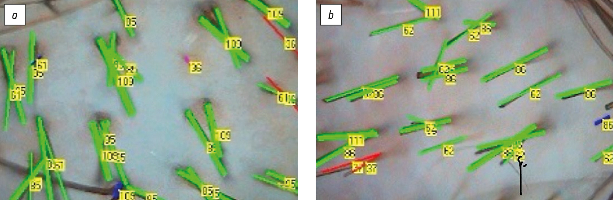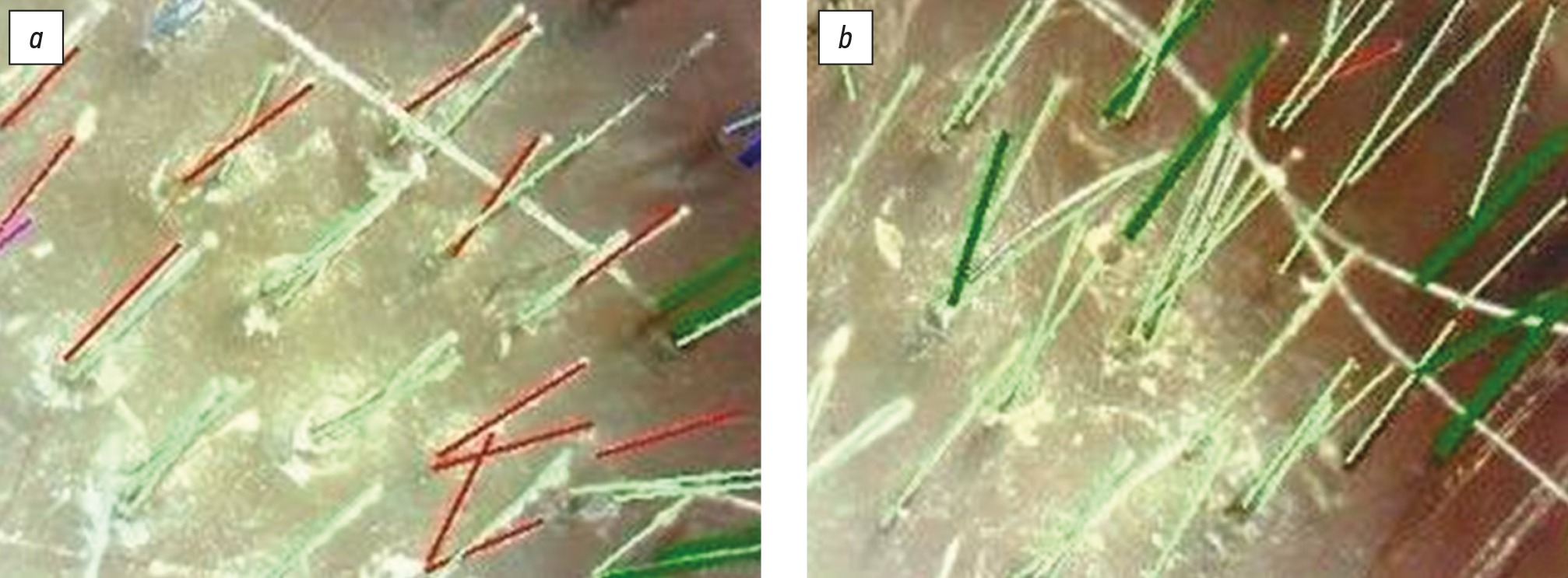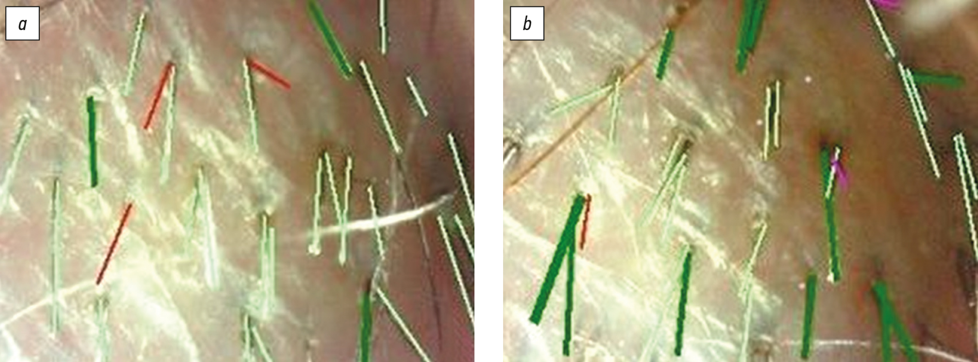 Рис. 5. Трихоскопия теменной (a) и затылочной (b) области пациентки Л. после лечения экзосомами, ×60. [Фото из архива Первого МГМУ имени И.М. Сеченова. Публикуется впервые с разрешения администрации учреждения].