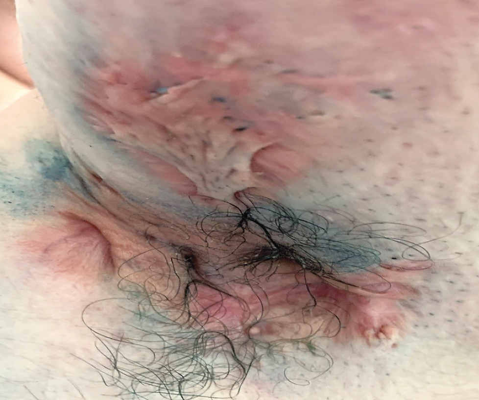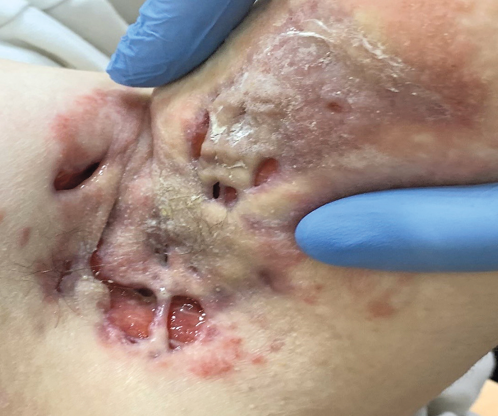 Клиническая картина гнойного гидраденита характеризовалась симметрично расположенной, сопровождающейся болью полиморфной сыпью, локализующейся на участках кожи с наличием большого количества апокриновых потовых желёз (пахово-бедренная складка, подмышечная и аногенитальная области, складки под молочными железами у женщин). На указанных участках кожного покрова наблюдались плотные при пальпации папулы и узлоподобные элементы застойно-красного цвета, некоторые из которых при слиянии образовывали обширные участки значительной инфильтрации кожи. На фоне выраженных инфильтративных процессов формировались абсцессы и свищевые ходы (рис. 1). У двух больных в результате частичного разрешения эффлоресценций сформировались гипертрофические мостовидные рубцы.