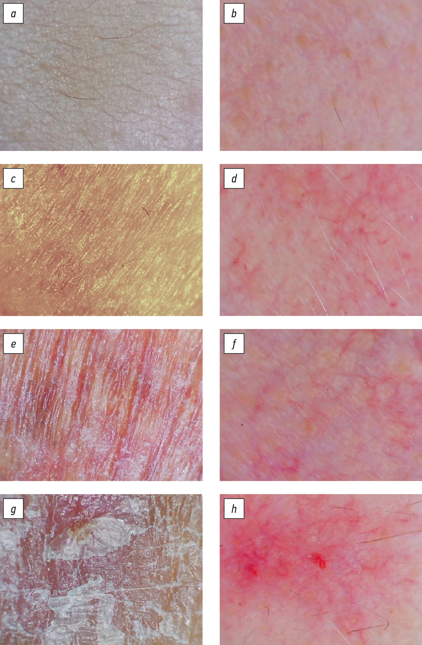 Рис. 1. Дерматоскопические снимки кожи пациента, указывающие на прогрессирование кожного воспаления во время лучевой терапии: a — транзиторная невыраженная эритема; b — линейно разветвлённые и изогнутые ретикулярные сосуды; c — выраженная эритема, эпиляция, отёк и влажное шелушение; d — линейно разветвлённые ретикулярные; фолликулярные пробки, расположенные в форме розеток; очаговое изъязвление; e — яркая эритема, эпиляция, сливающееся влажное шелушение; f — линейные разветвлённые сосуды, фолликулярные пробки, перифолликулярная пигментация; g — очаг изъязвления, сквамозные элементы; h — линейные разветвлённые и изогнутые ретикулярные сосуды, эрозии и изъязвления.