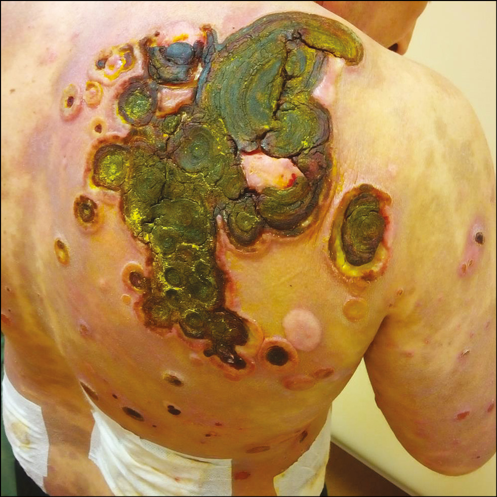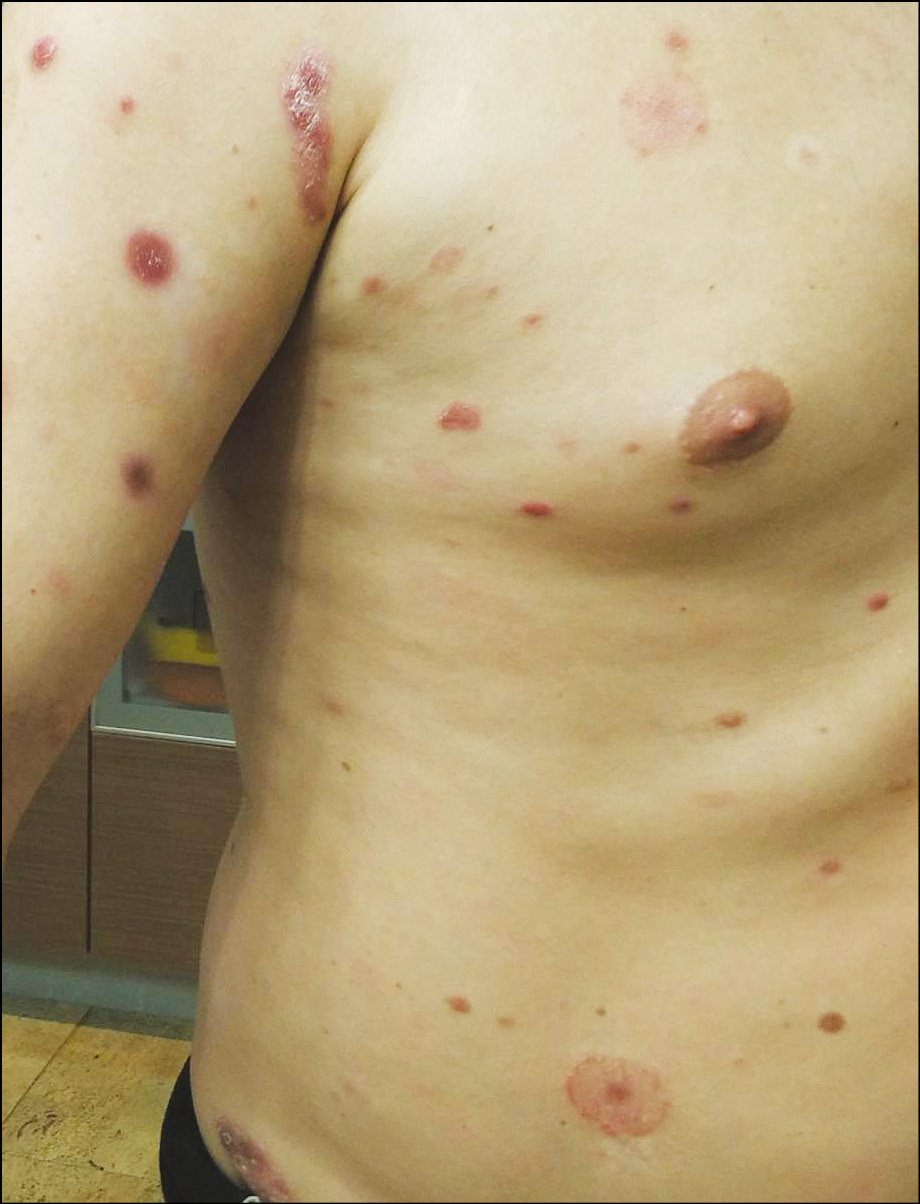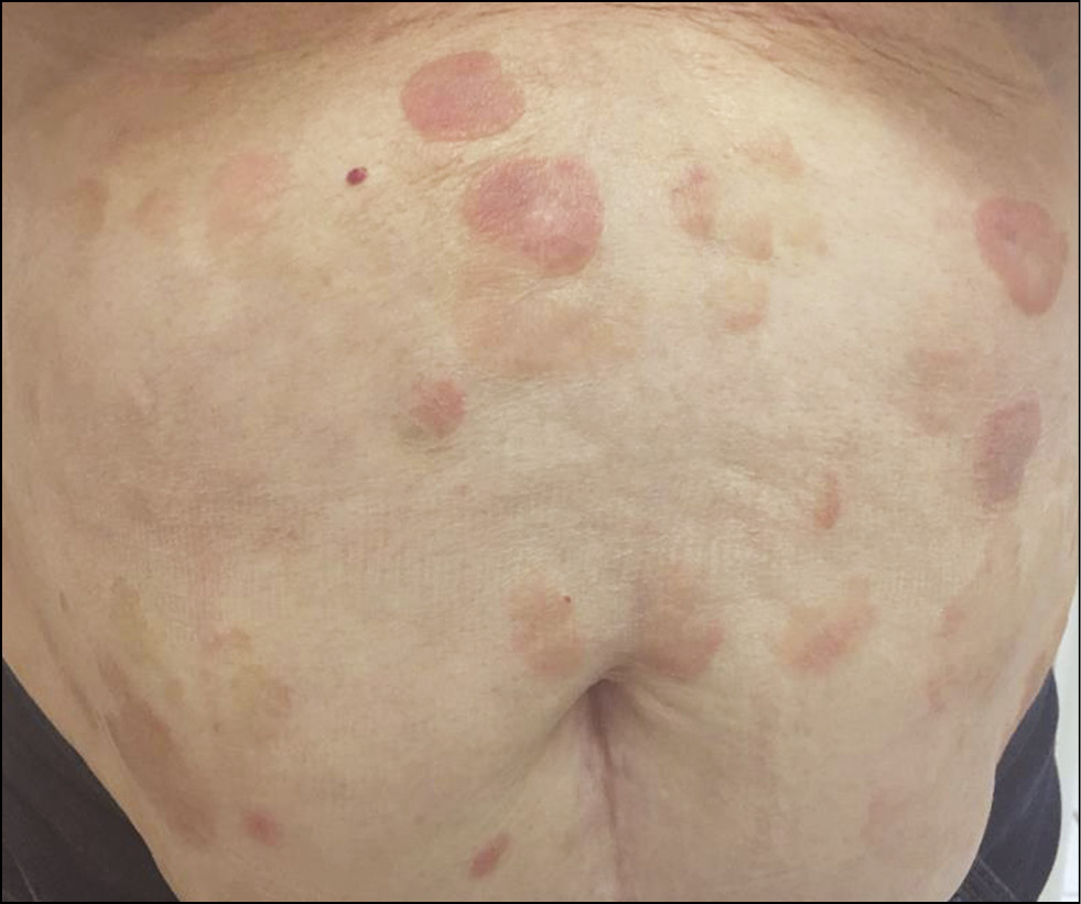 Рис. 11. Первичная кожная анапластическая крупноклеточная лимфома: рупеоидные высыпания кожи спины. Фото Черновой Н.Г. / Fig. 11. Primary cutaneous anaplastic large cell lymphoma: rupeoid eruptions of the back skin. Photo by N.G. Chernovaya.