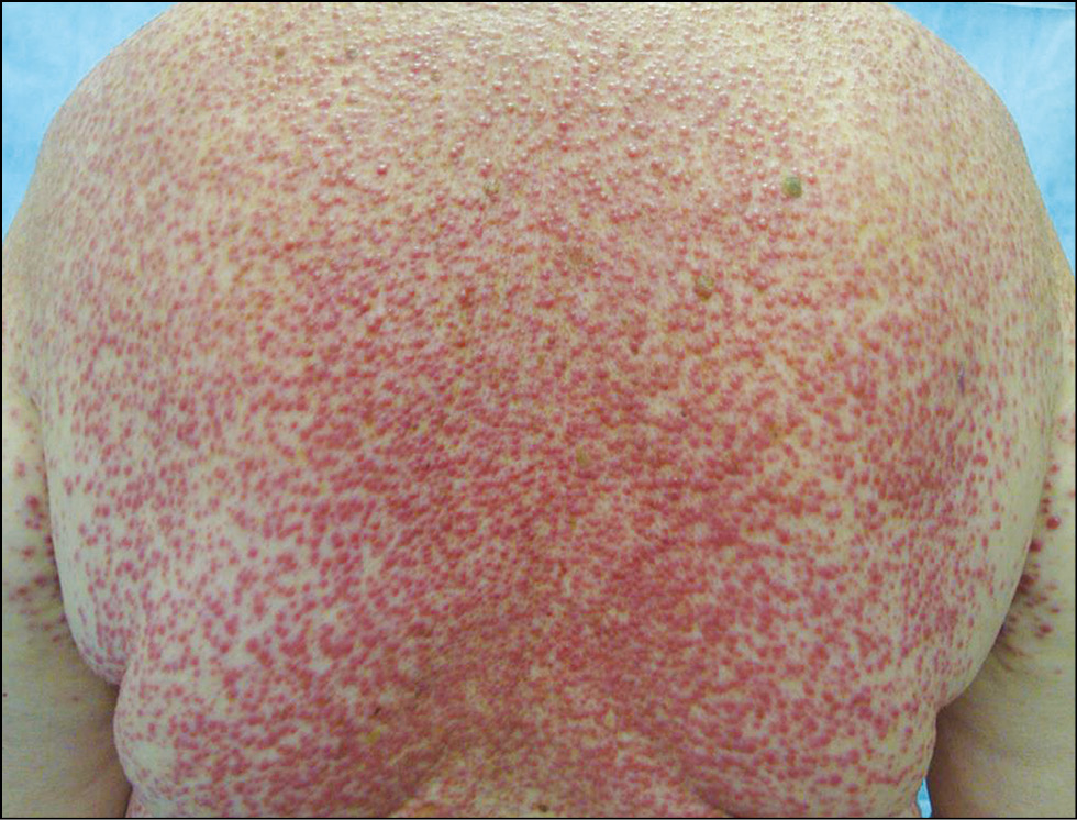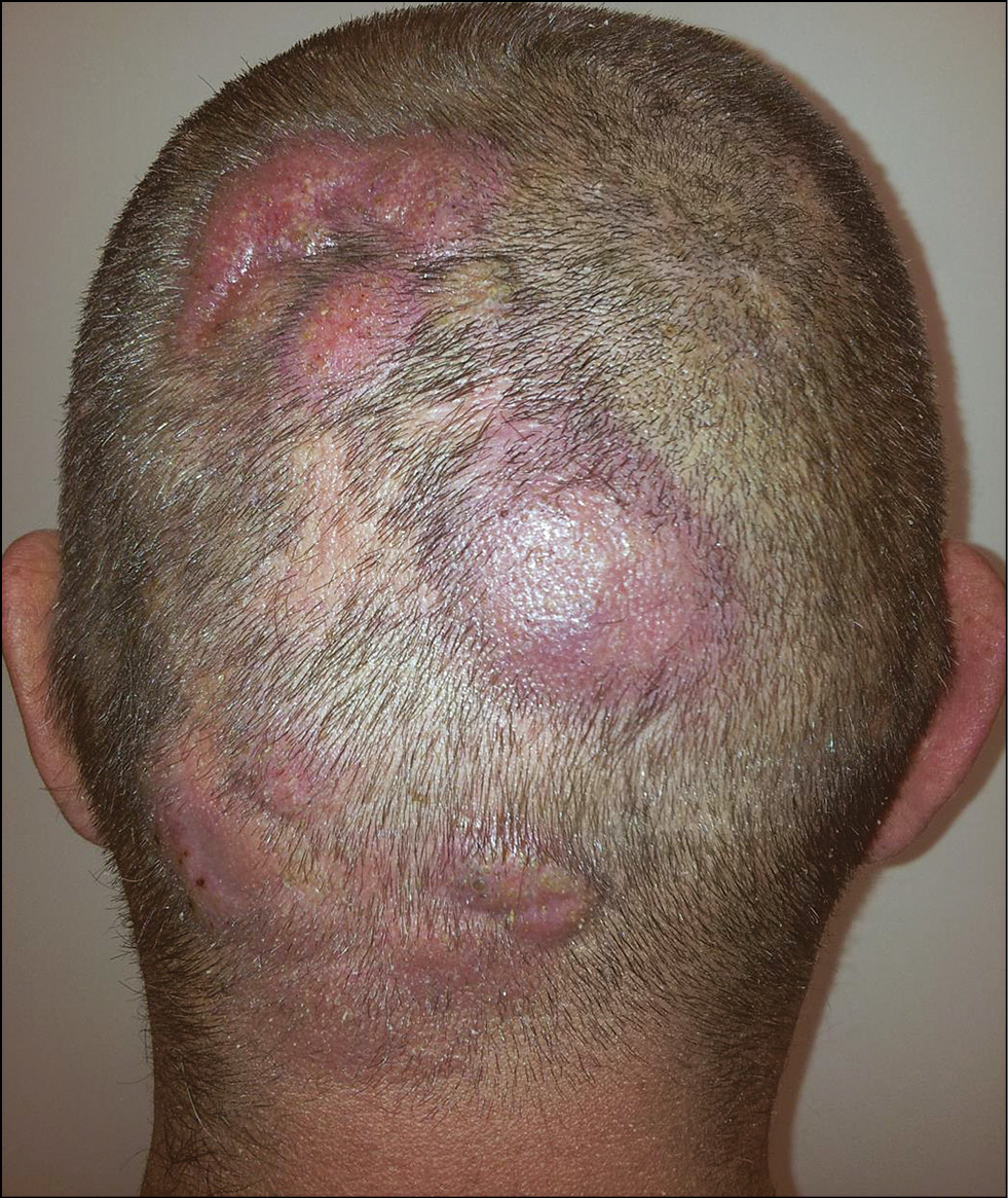 Рис. 13. Грибовидный микоз: множественные узлы на голове. / Fig. 13. Fungal mycosis: multiple nodes on the head.