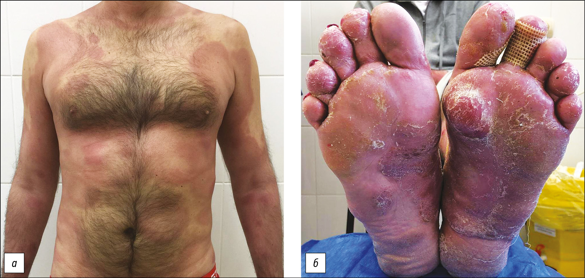 Рис. 12. Первичная кожная CD4+ плеоморфная Т-клеточная лимфома: а ― пятна и бляшки на коже туловища; б ― узел на стопе. / Fig. 12. Primary cutaneous CD4+ pleomorphic T-cell lymphoma: а ― spots and plaques on the skin of the trunk; б ― knot on the foot.
