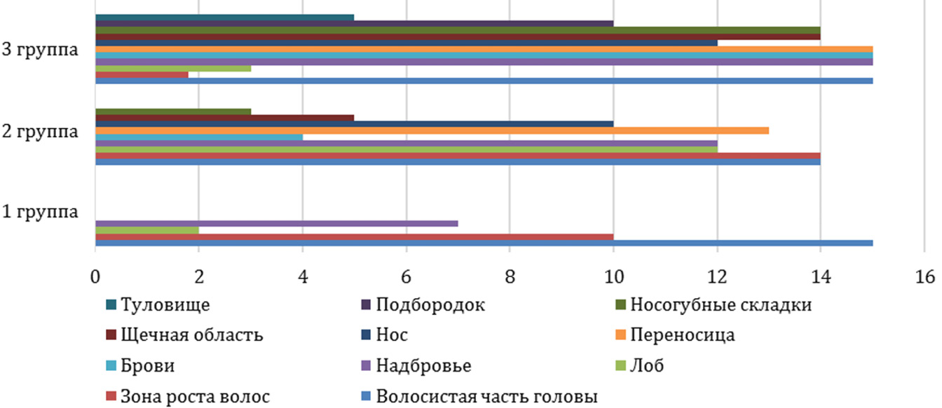 Оценка тяжести СД лица и волосистой части головы показала лёгкую степень у всех (100%) пациентов 1-й группы. Во 2-й группе среднетяжёлая степень заболевания наблюдалась у 7 (46,7%) пациентов, тяжёлая ― у 8 (53,3%); в 3-й группе ― у 10 (82%) и 5 (18%) соответственно. Тяжесть заболевания СД лица сопровождалась увеличением количества других зон, вовлечённых в патологический процесс (рис. 1, 2).