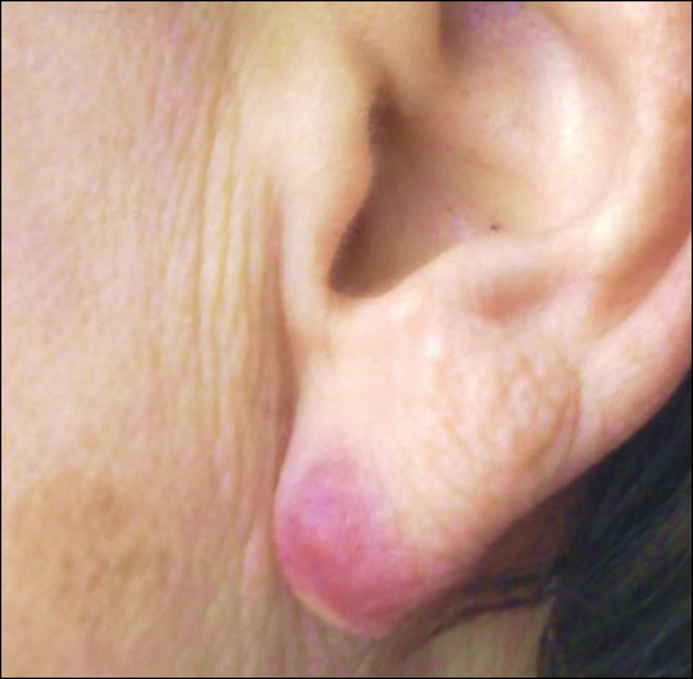 Рис. 18. Пациентка Т., 67 лет. Крупноузелковый саркоид Бека ушной раковины, единичный узел. / Fig. 18. Patient T., 67 years old. Large-nodular Beck’s sarcoid of the auricle, single node.