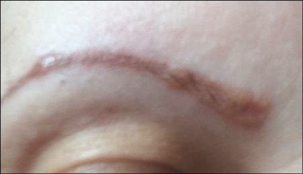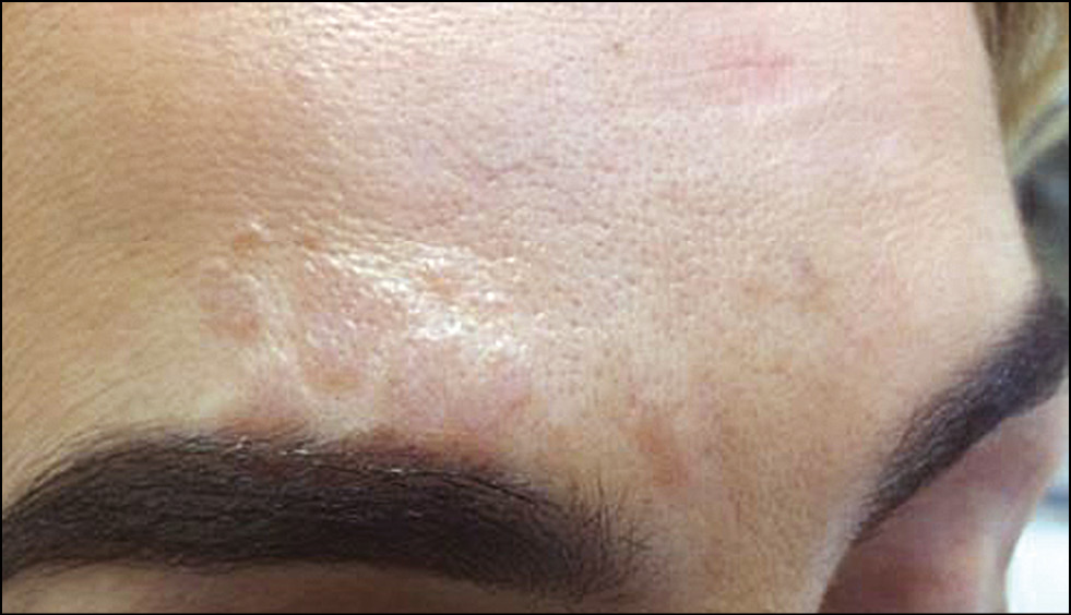 Рис. 20. Больная А., 37 лет. Крупноузелковый саркоид Бека, возникший на коже бровей и в надбровной области сразу после татуажа и покраски бровей. / Fig. 20. Patient A., 37 years old. Beck’s large nodular sarcoid, which arose immediately after tattooing and dyeing the eyebrows both on the skin of the eyebrows and in the superciliary region.