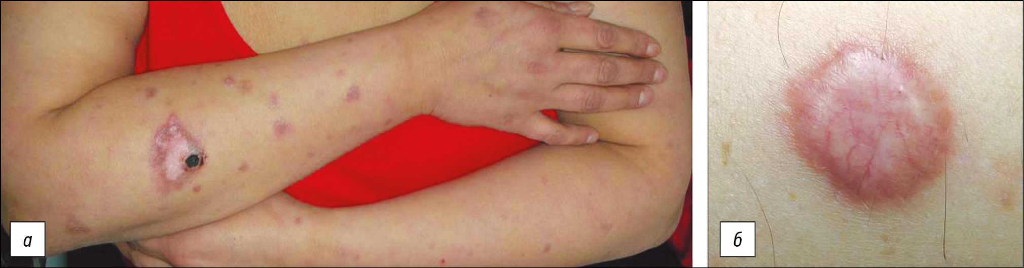 Рис. 21. Больная И., 48 лет: а ― сочетание типичного мелкоузелкового и атипичного варианта аннулярного саркоида Бека; б ― фрагмент кожи руки: типичный узел при саркоидозе с множественными телеангиэктазиями на поверхности. / Fig. 21. Patient I., 48 years old: а ― combination of typical small-nodular and atypical variants of Beck’s annular sarcoid; б ― fragment of the hand skin: a typical sarcoidosis node with multiple surface telangiectasias.