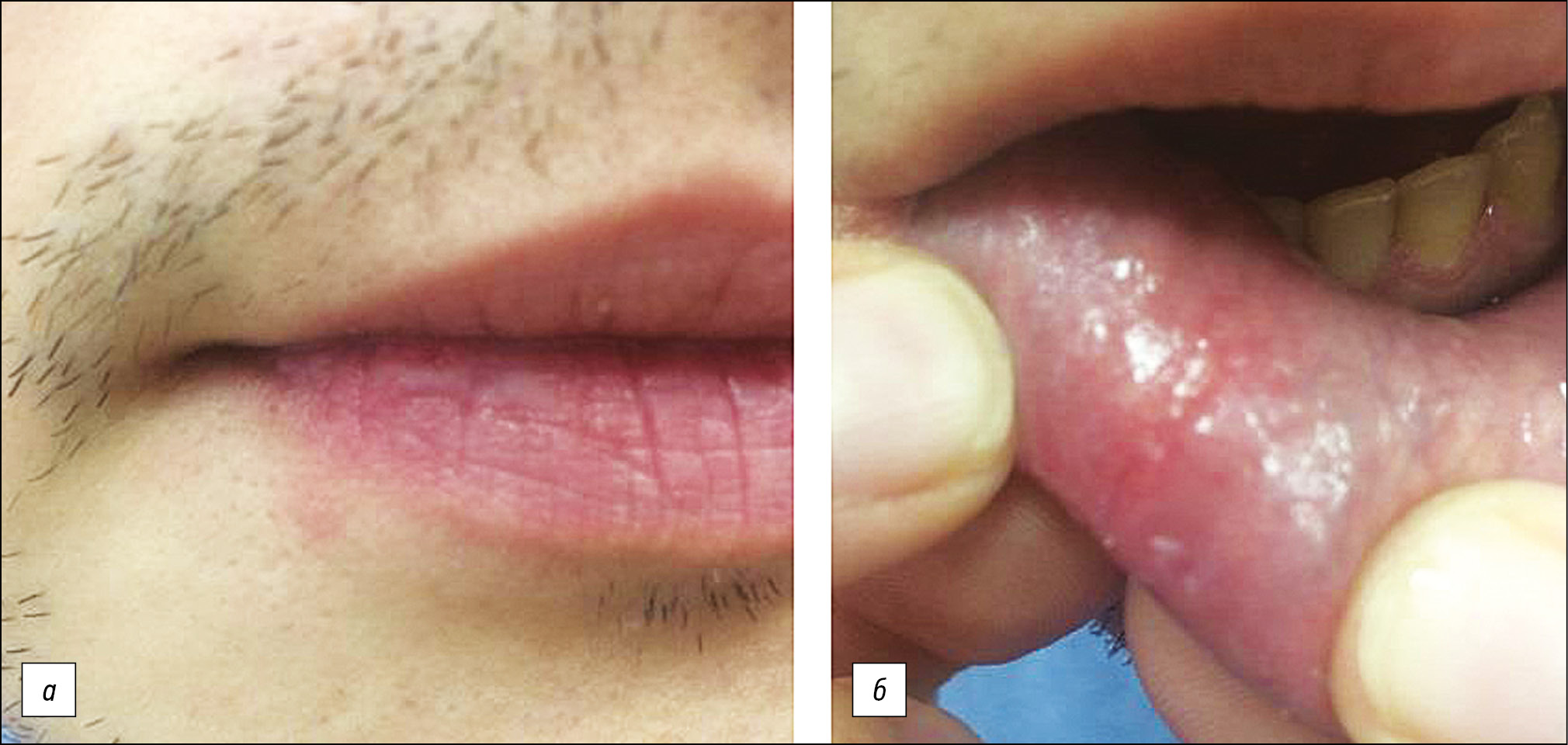 Рис. 22. Больной Ф., 28 лет: а ― мелкоузелковый саркоид, возникший после систематического курения кальяна; б ― поражение красной каймы нижней губы и слизистой оболочки. / Fig. 22. Patient F., 28 years old: а ― small-knot sarcoidosis, which has arisen after systematic hookah smoking; б ― lesion of the red border of the lower lip and mucous membrane.