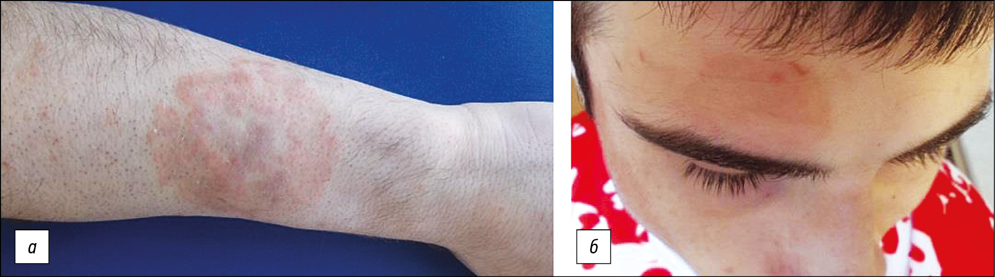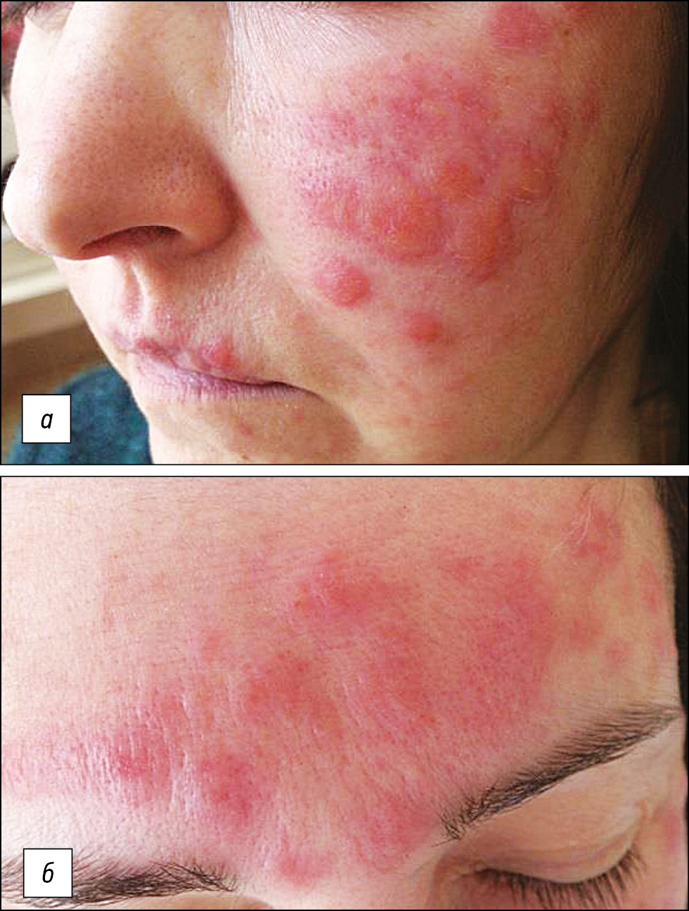 Рис. 23. Больной П., 18 лет: а ― крупноузелковый саркоид Бека; б ― высыпания на лице. / Fig. 23. Patient P., 18 years old: а ― Beck’s large nodular sarcoid; б ― rash on the face.