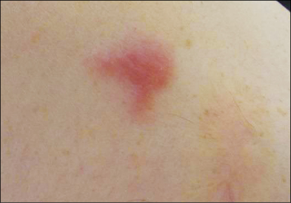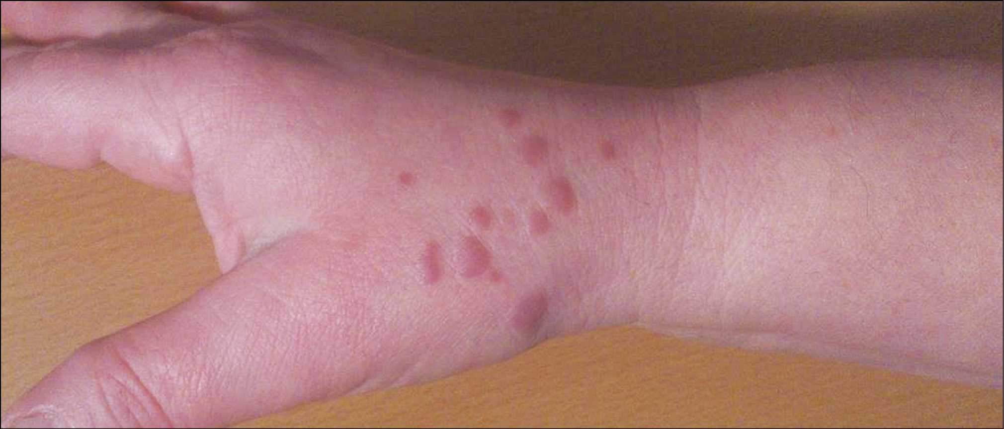 Рис 19. Больная Н., 45 лет. Мелкоузелковый саркоид, возникший через 11 лет на месте татуажа. При обследовании выявлен саркоидоз внутригрудных лимфоузлов. / Fig. 19. Patient N., 45 years old. Small-knot sarcoidosis that arose 11 years later at the site of tattooing. Swarm examination revealed sarcoidosis of the intrathoracic lymph nodes.