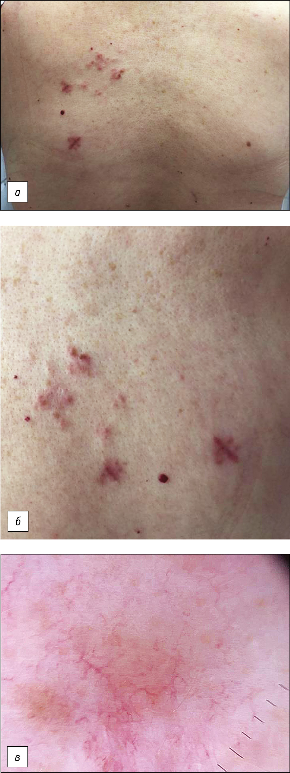 Рис. 26. Больная Р., 49 лет: а ― мелкоузелковый саркоид Бека; б ― фрагмент кожи туловища более крупным планом; в ― феномен «пылинок», телеангиэктазии при дерматоскопии. / Fig. 26. Patient R., 49 years old: а ― Beck’s small-nodular sarcoid; б ― close-up photo of the trunk skin fragment; в ― the phenomenon of «dust particles», telangiectasia during dermatoscopy.