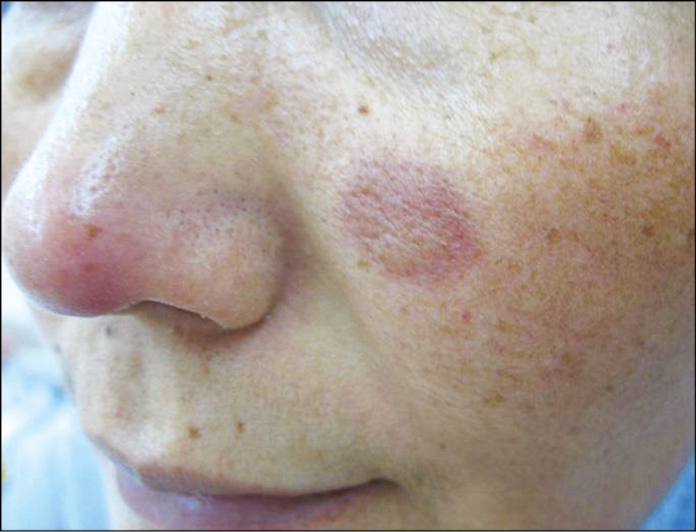 Рис. 17. Больная З., 65 лет. Атипичный вариант саркоидоза: аннулярный саркоид Бека. Диаскопия: феномен «пылинок» положительный. / Fig. 17. Patient Z., 65 years old. Atypical variant of sarcoidosis: Beck’s annular sarcoid. Diascopy: the phenomenon of “dust particles” is positive.