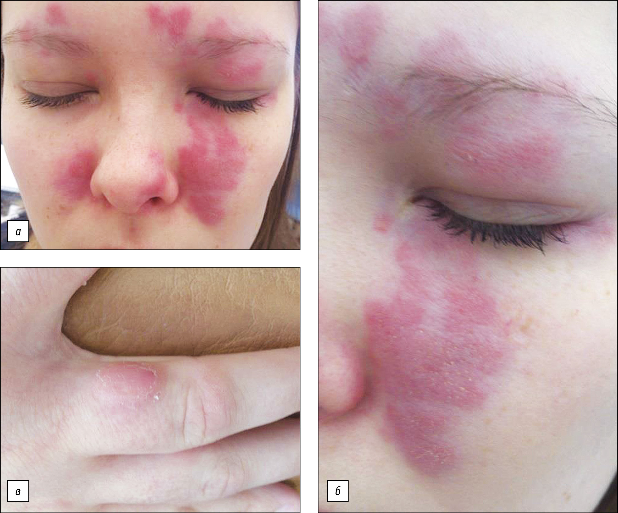 Рис. 30. Больная Л., 18 лет: а ― озноблённая волчанка Бенье–Теннессона; б ― фрагмент кожи лица более крупным планом; в ― крупный узел на указательном пальце кисти. / Fig. 30. Patient L., 18 years old: а ― feverish lupus erythematosus Benier–Tennesson; б ― close-up photo of the facial skin fragment; в ― large knot on the index finger of the hand.