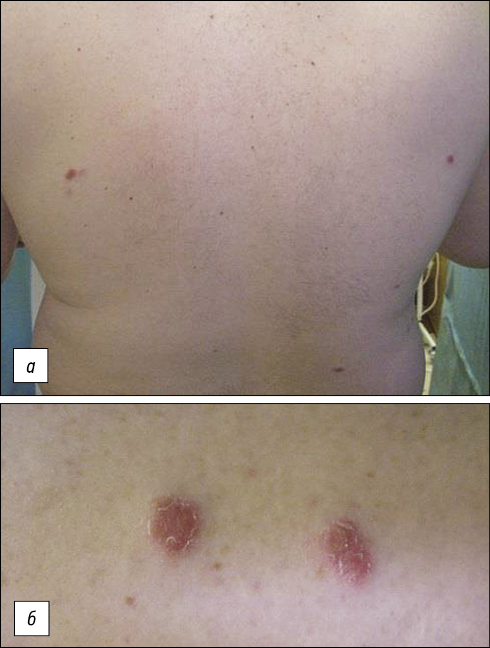 Рис. 33. Больная П., 50 лет: а ― крупноузелковый саркоид Бека; б ― фрагмент кожи спины более крупным планом. / Fig. 33. Patient P., 50 years old: а ― Beck’s large nodular sarcoid; б ― a fragment of the skin of the back in a closer view.