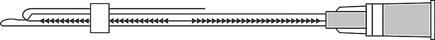 Лифтинговые нити DG-Lift® с часто расположенными формованными 3D-шипами в качестве фиксирующих элементов, толщина шипа приближена к толщине оси нити (равномерное сцепление и равномерная резорбция); рис. 1. Оптимальная толщина лифтинговых струн ― 0/0-1 USP (0,4 мм в диаметре), оптимальная длина лифтинговых трасс равна длине рабочей поверхности нити ― 100 мм (185 мм вся нить). Каждая нить предустановлена в канюлю-проводник L-типа 18G-100 мм. Материал лифтинговых нитей: мелкопористый высокоплотный PDO (срок резорбции 8–12 мес); сополимер PLACL 75% L-лактид и 25% Е-капролактон (срок резорбции 2–2,5 года).