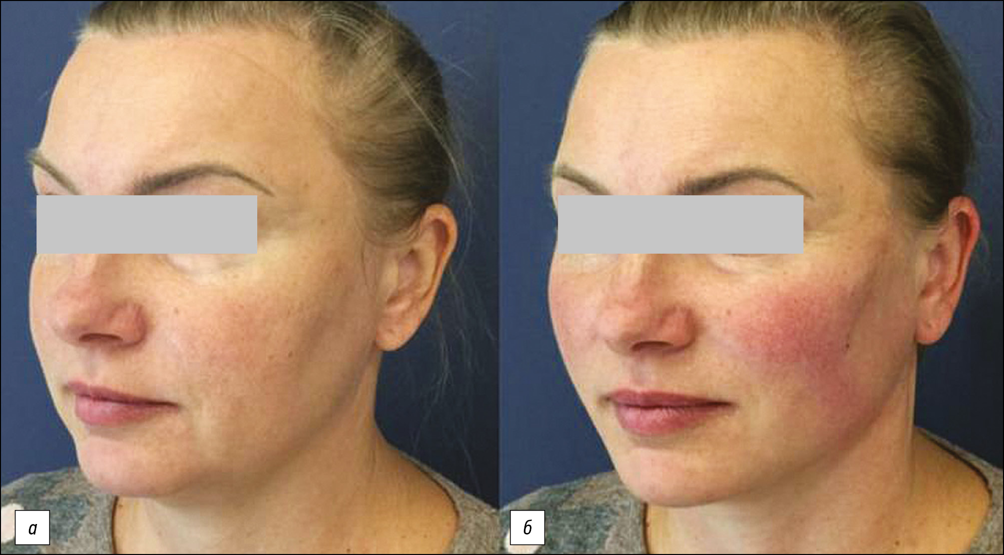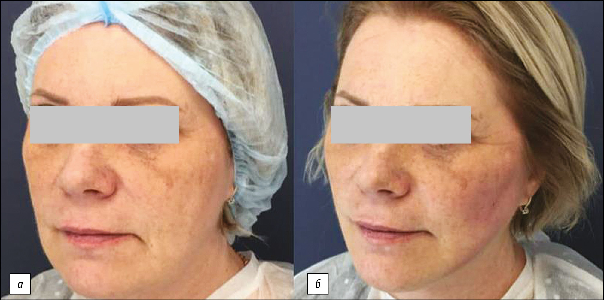 Рис. 5. Пациентка А., 44 года: а ― до процедуры сочетанной нитевой имплантации; б ― после процедуры: степень удовлетворённости результатом 3 балла по шкале GAIS (отмечается выраженный эстетический эффект). / Fig. 5. Patient А., 44 years old: а ― before the procedure of combined thread implantation; б ― after the procedure: the degree of satisfaction with the result is 3 points on the GAIS scale (there is a pronounced aesthetic effect).