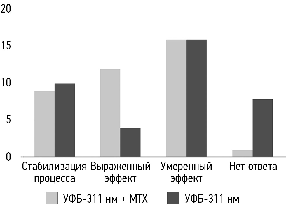 Схема терапии. В ходе исследования больные группы I получали метотрексат в сочетании со средневолновой узкополосной терапией УФБ-311 нм (3 сеанса в неделю). Использовали малые дозы метотрексата ― 10 мг 1 раз/нед на протяжении 6 мес. Курсовая доза составила 240 мг. Для минимизации побочных и нежелательных явлений на протяжении всего курса терапии пациентам была назначена фолиевая кислота по 5 мг/сут, кроме дня получения метотрексата.