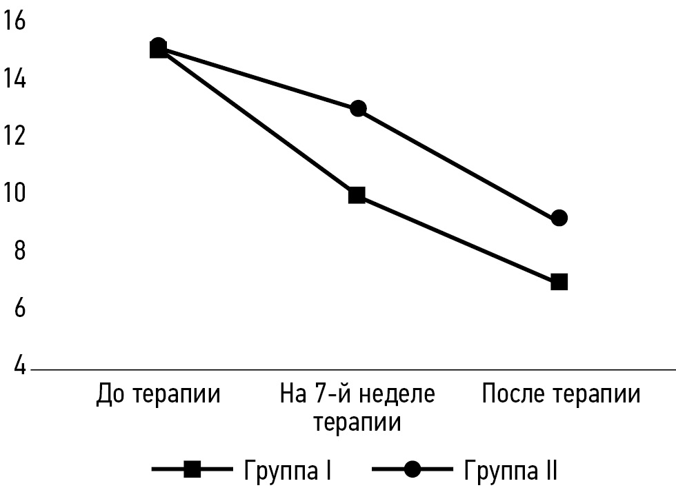 Средний балл ДИКЖ в обеих группах до начала лечения составил 15 (диапазон 9–21), при этом максимальный балл чаще всего выбирался для пунктов 2 (неловкость и стыд за состояние кожи), 4 (влияние на выбор одежды), а минимальный ― для пункта 1 (зуд, жжение, болезненность). На 7-й нед терапии в группе I средний балл ДИКЖ равнялся 10 баллам, во II ― 13 баллам. После проведённой терапии ДИКЖ в группе I в среднем составлял 7 баллов (диапазон 4–10), во II ― 9 баллов (диапазон 6–12); рис. 2.