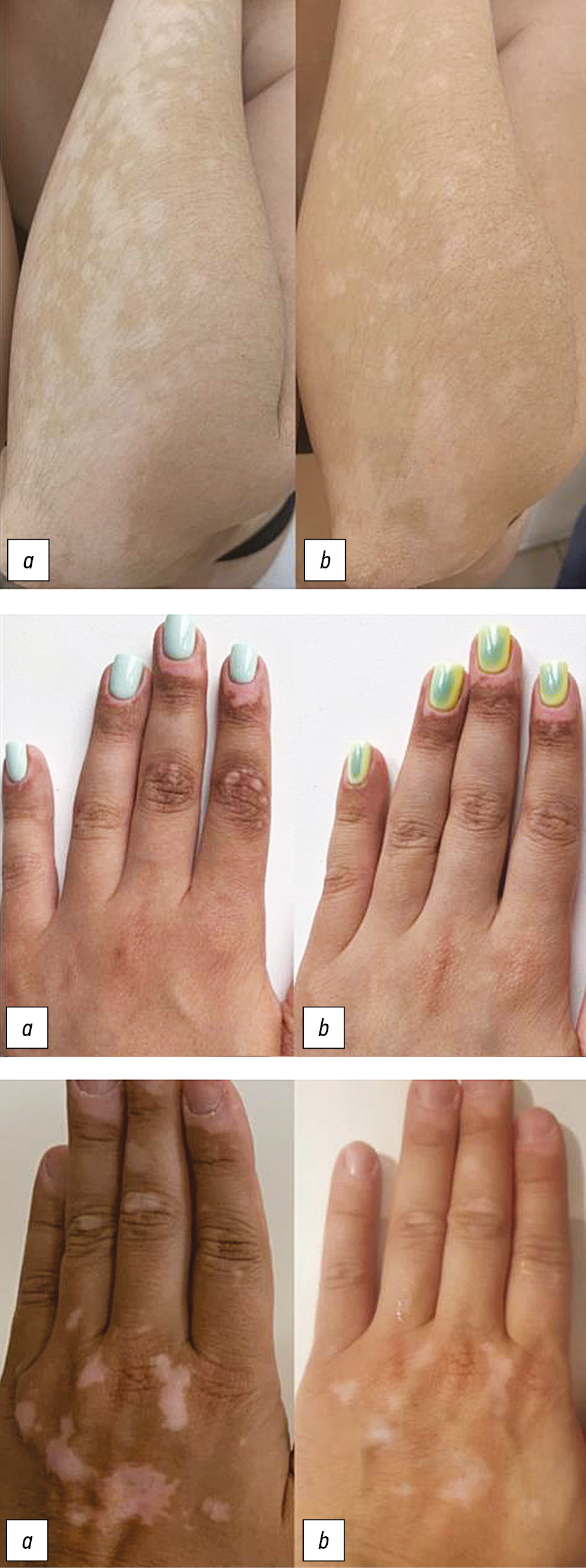 Рис. 3. Фоторегистрация пациентов: a ― прогрессирующее витилиго до терапии; b ― после проведённого курса терапии (метотрексат + УФБ-311 нм). / Fig. 3. Photoregistration of patients: a ― progressive vitiligo before therapy; b ― after the course of therapy (methotrexate + UVB-311 nm).