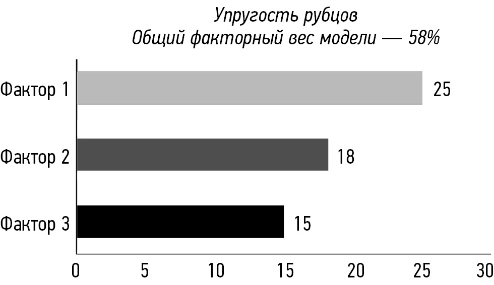 Рис. 4. Удельный вес структуры исходных признаков: показателей эластичности и васкуляризации (фактор 1), фототипа и наличия в анамнезе акне (фактор 2), сроков существования рубца (фактор 3), значимо определяющих дисперсию изменения упругости у пациентов с формирующимися атрофическими рубцами в течение курса высокоинтенсивной лазеротерапии. / Fig. 4. The share of the structure of initial signs: indicators of elasticity and vascularization (factor 1), phototype and history of acne (factor 2), scar life (factor 3), that significantly determine the dispersion of changes in elasticity in patients with developing atrophic scars during the course of high-intensity laser therapy.