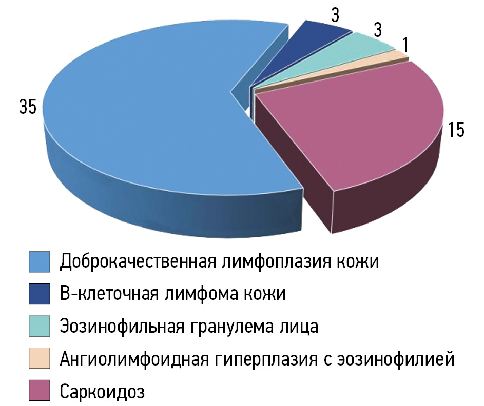 В результате дообследования, включавшего тщательный сбор анамнеза, проведение гистологического, при необходимости ― иммуногистохимического и молекулярно-генетического исследования, первичные диагнозы были уточнены, в результате чего сформированы основная группа (ДЛК: n=35; 70%) и группа дифференциального диагноза (ВКЛК: n=3; 14%; саркоидоз: n=15; 68%; эозинофильная гранулёма лица: n=3; 14%; ангиолимфоидная гиперплазия с эозинофилией: n=1; 4%).