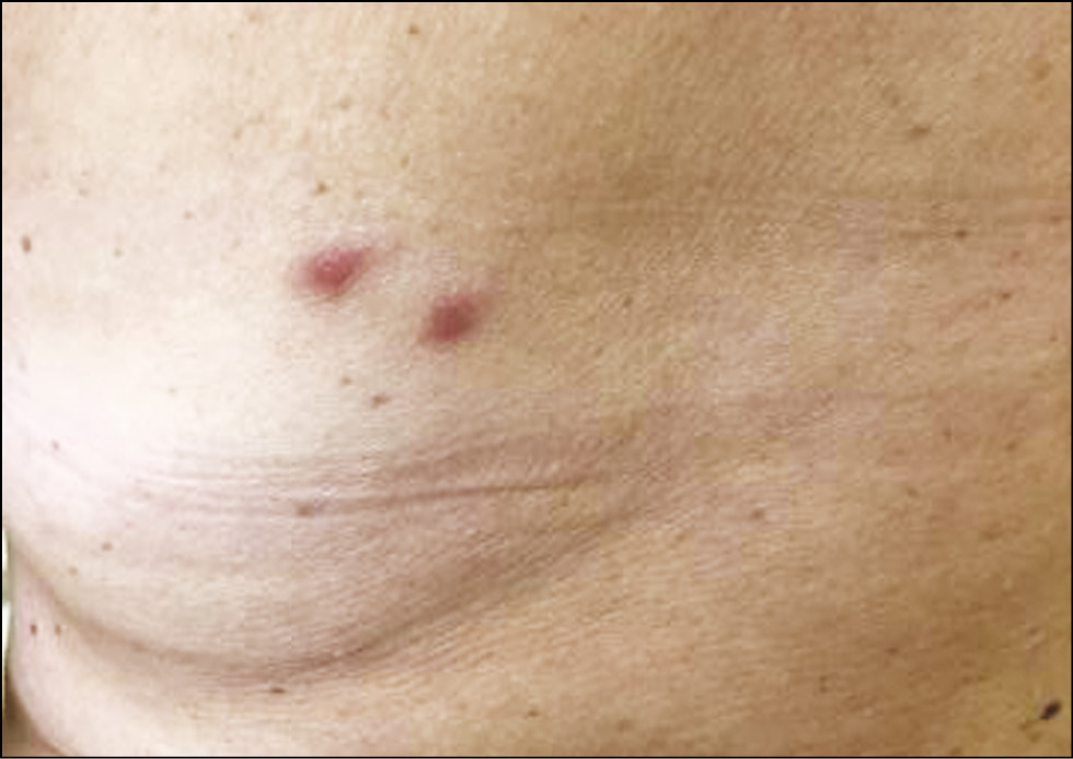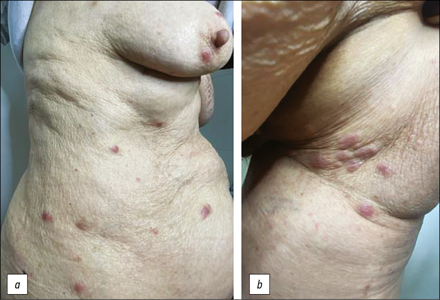 Рис. 5. Больная Н., 73 года. Постскабиозная лимфоплазия кожи. / Fig. 5. Patient N., 73 y.o. Cutaneous lymphoid hyperplasia after scabies.