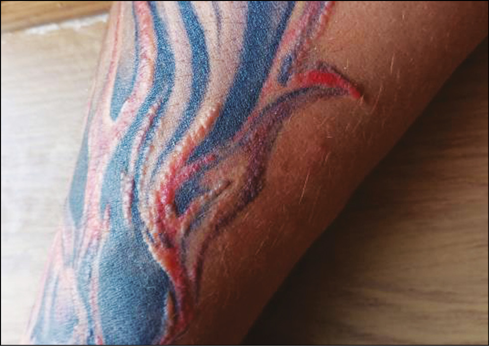 Рис. 3. Больной Е., 32 года. Доброкачественная лимфоплазия кожи как реакция на татуировку. / Fig. 3. Patient E., 32 y.o. Cutaneous lymphoid hyperplasia after tattoo.