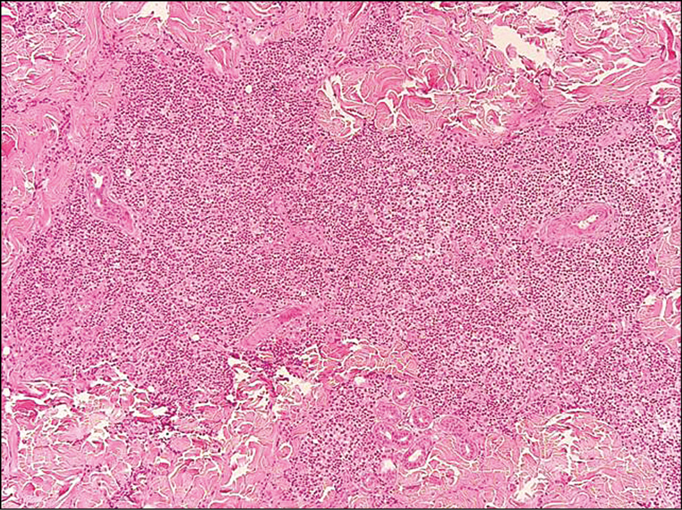 Рис. 6. Патоморфологические особенности доброкачественной лимфоплазии кожи с неустановленной причиной: плотная очаговая лимфоидная инфильтрация с примесью макрофагов располагается преимущественно периваскулярно, ×100. / Fig. 6. Pathomorphological features of benign lymphoplasia of the skin with an unknown cause: сutaneous lymphoid hyperplasia, unknown cause. Mainly perivascularly located dense focal lymphoid infiltration with an admixture of macrophages, ×100.