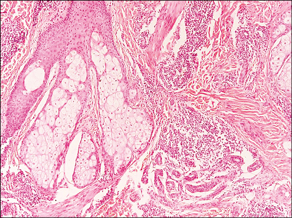 Для оценки патоморфологических изменений и проведения молекулярно-генетического анализа пациентам после получения от них информированного согласия проводилась биопсия очага поражения с использованием инфильтрационной анестезии раствором новокаина и последующим наложением швов. Биопсийный материал помещался в стеклянную тару с 10%-м нейтральным формалином, после чего подвергался стандартной проводке с последующей парафиновой заливкой. Полученные срезы толщиной 2–4 мкм окрашивались гематоксилином-эозином. Гистологическое исследование выполнялось с помощью светового микроскопа Carl Zeiss (Германия) с увеличением 50; 100; 200; 400.
