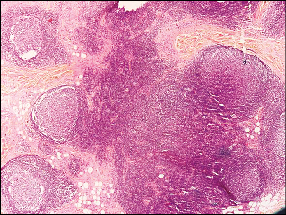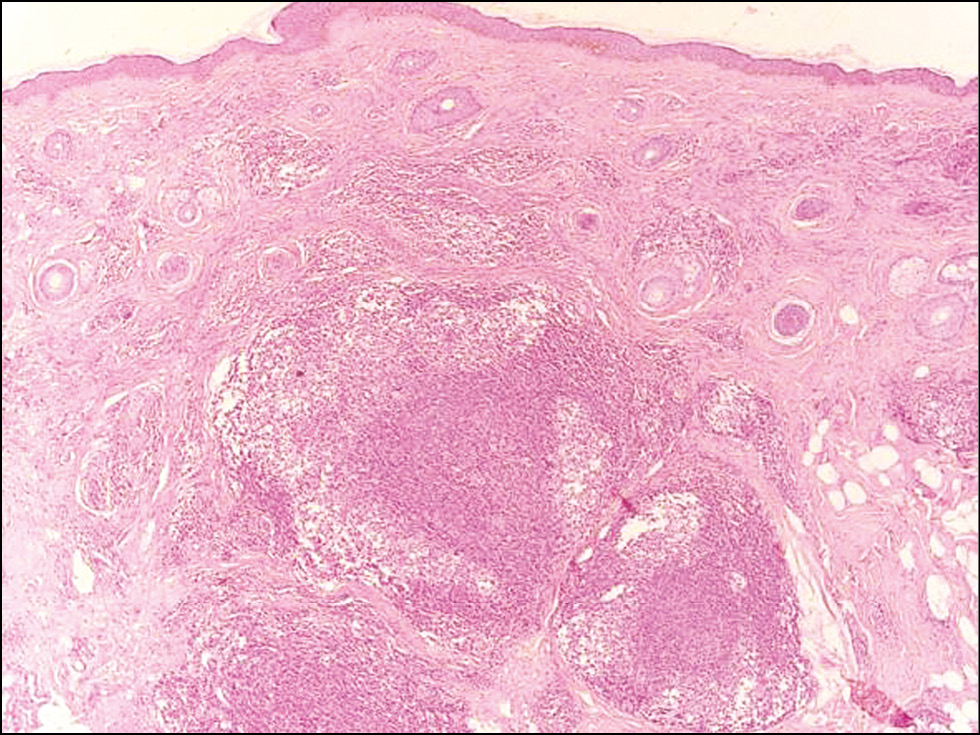 Рис. 8. Патоморфологические особенности доброкачественной лимфоплазии кожи: эпидермис и придатки кожи не повреждены; в средних, глубоких отделах дермы и подкожно-жировой клетчатке определяется очаговая лимфоидная инфильтрация с формированием фолликулоподобных структур с герминативными центрами, ×50. / Fig. 8. Pathomorphological features of benign lymphoplasia of the skin: the epidermis and appendages of the skin are not damaged. Focal lymphoid infiltration with the formation of follicle-like structures with germinative centers is determined in the middle, deep parts of the dermis and in subcutaneous adipose tissue, ×50.