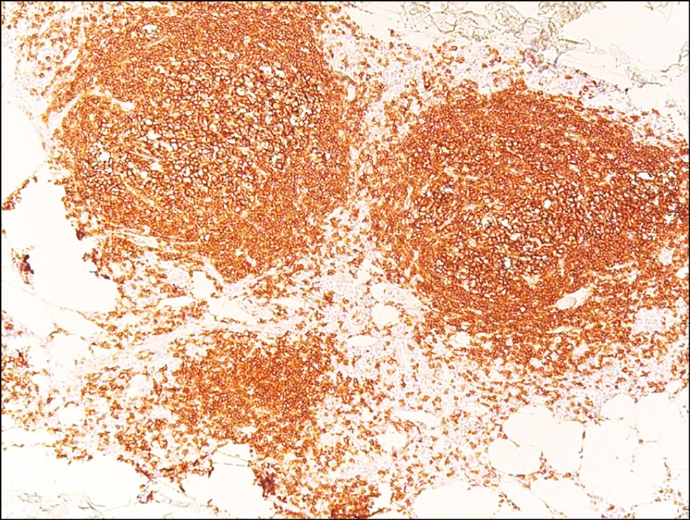 Рис. 10. Иммуногистохимическое исследование кожи: CD20+ В-лимфоциты в лимфоидных фолликулах, ×200. / Fig. 10. Immunohistochemical examination of the skin: CD20+ B-lymphocytes in lymphoid follicles, ×200.
