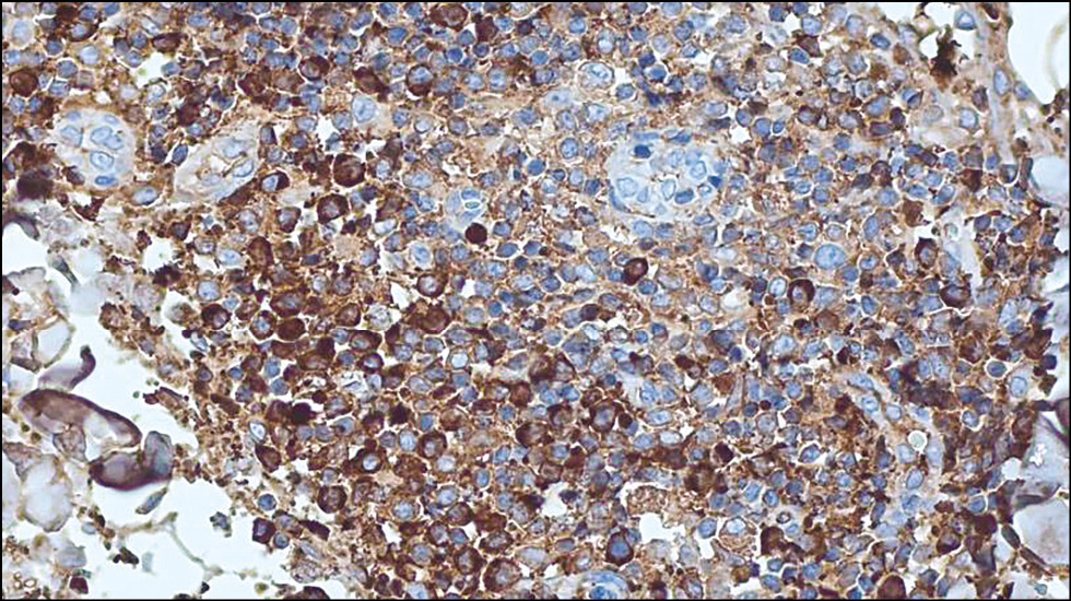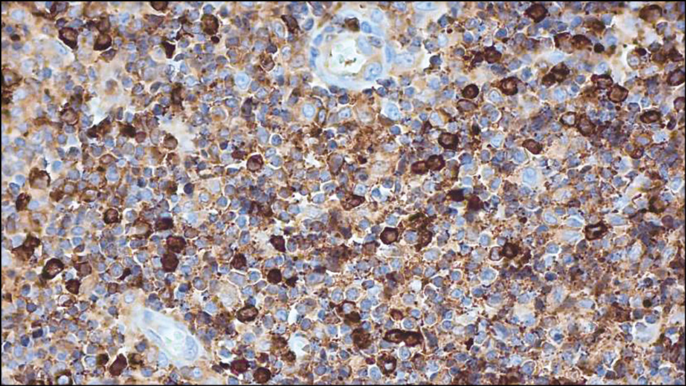 Рис. 12. Иммуногистохимическое исследование кожи: экспрессия IgL λ, ×400. / Fig. 12. Immunohistochemical examination of the skin: expression of IgL λ, ×400.