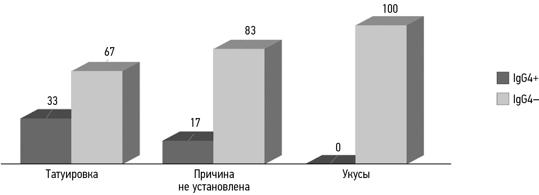 Рис. 13. Экспрессия IgG4 и провоцирующий фактор доброкачественной лимфоплазии кожи. / Fig. 13. IgG4 expression and provoking factor of cutaneous cutaneous lymphoid hyperplasia.