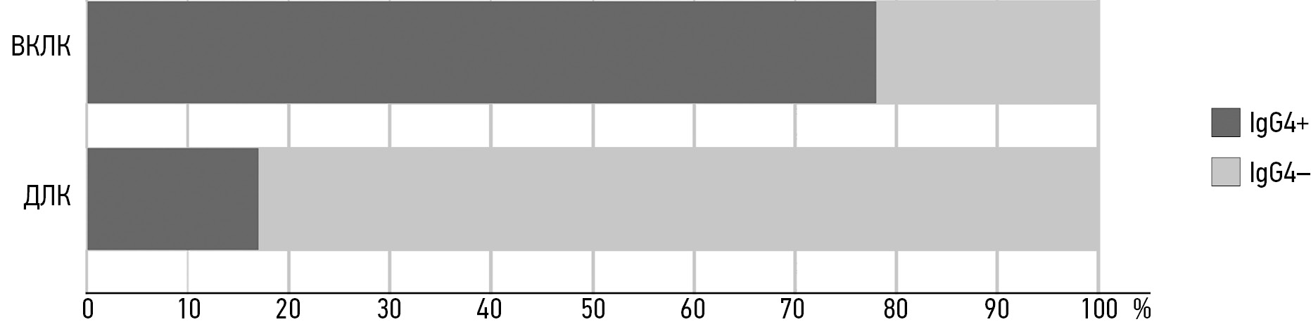 В последнее время на фоне широкого изучения роли иммунных механизмов канцерогенеза всё больший интерес для учёных представляет IgG4, появляющийся в организме при длительной антигенной стимуляции. Доказано, что он способен ингибировать местный гуморальный и клеточный иммунный ответ и индуцировать рост раковых клеток [6]. Обнаружена повышенная концентрация IgG4+, ассоциированная с неблагопритным прогнозом, при меланоме [7], глиобластоме [8], раке органов желудочно-кишечного тракта [9]. Описано также несколько случаев IgG4+ лимфом в различных органах [10–12]. Наряду с этим есть сообщения об экспрессии IgG4+ и при доброкачественных дерматозах [13]. Таким образом, имеющиеся данные об IgG4 в зарубежной литературе противоречивы, однако его участие в развитии злокачественных заболеваний, в том числе при лимфопролиферативных процессах, очевидно, что делает целесообразным изучение IgG4 в рамках поиска нового дифференциально-диагностического маркера ДЛК.