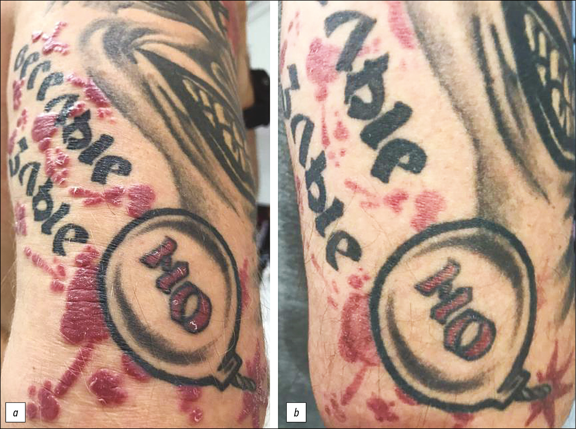 Рис. 15. Пациент Д., 37 лет. Доброкачественная лимфоплазия кожи на красный татуировочный пигмент: а ― до лечения; b ― после 6 сеансов фотодинамической терапии. / Fig. 15. Patient D., 37 y.o. Cutaneous lymphoid hyperplasia on a red tattoo: a ― before treatment; b ― after photodynamic therapy № 6.
