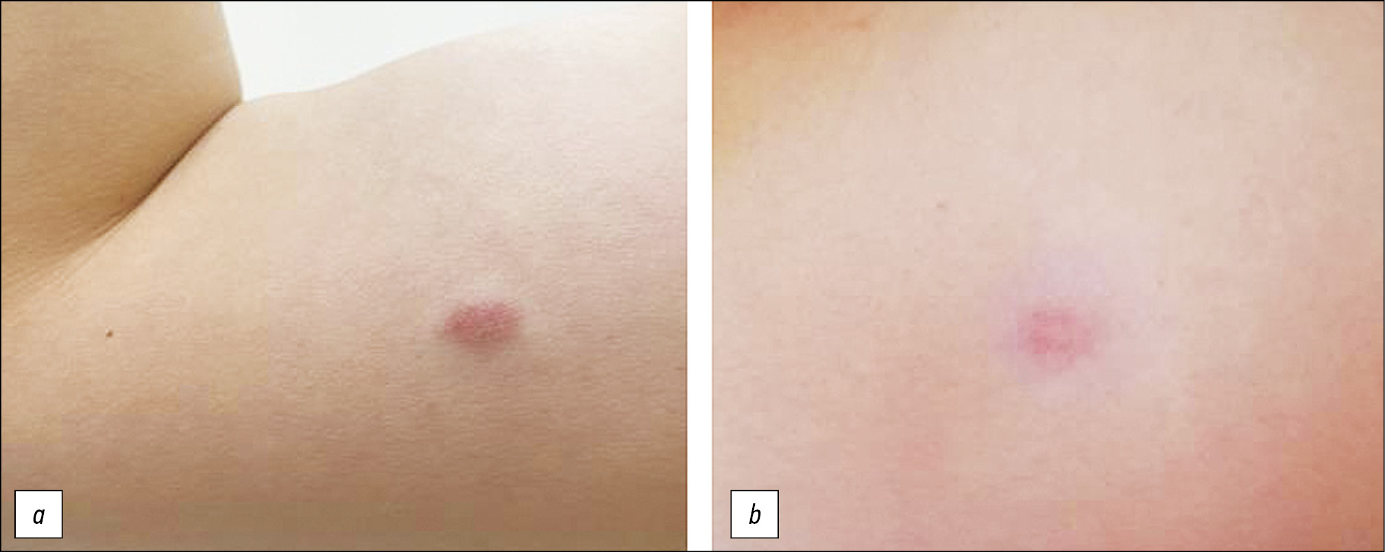 Рис. 16. Пациент Ш., 27 лет. Доброкачественная лимфоплазия кожи неясной этиологии: а ― до лечения; b ― после 4 сеансов фотодинамической терапии и одной инъекции суспензии бетаметазона. / Fig. 16. Patient Sch., 27 y.o. cutaneous lymphoid hyperplasia of unknown etiology: a ― before treatment; b ― after photodynamic therapy № 4, injections of betamethasone suspension № 1.