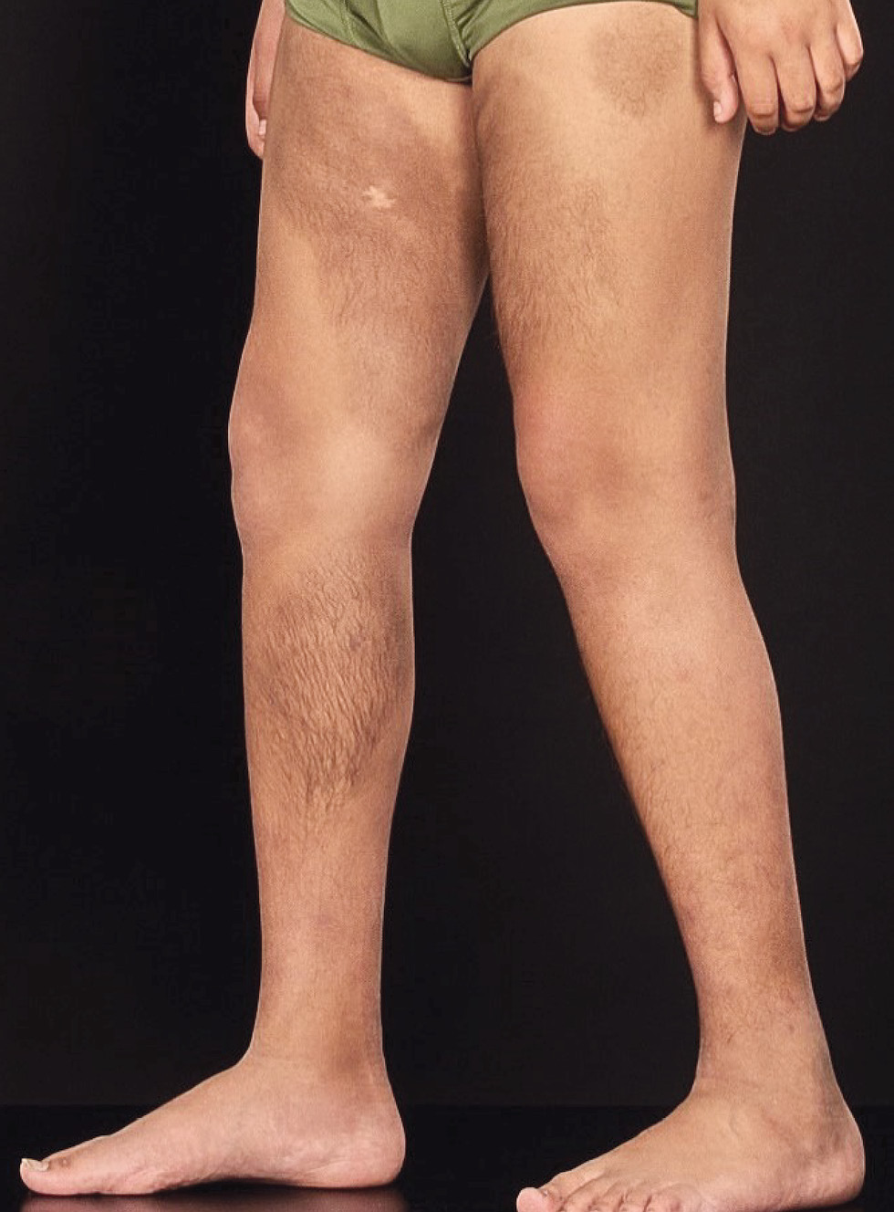 13-летний мальчик с симметричными высыпаниями на коже нижних конечностей, представленными гиперпигментированными плотными бляшками; также отмечается гипертрихоз. По результатам биопсии обнаружен фиброз с гистиоцитарным и лимфоплазмоцитарным инфильтратом. Выявление мутации гена SLC29A3 подтвердило H-синдром (синусный гистиоцитоз с массивной лимфоаденопатией; OMIM 602782). H-синдром ― это аутосомно-рецессивный генодерматоз, который может ассоциироваться с такими системными нарушениями, как гипергликемия, гепатоспленомегалия, гипогонадизм, вальгусная деформация, карликовость, тугоухость, заболевания сердца.