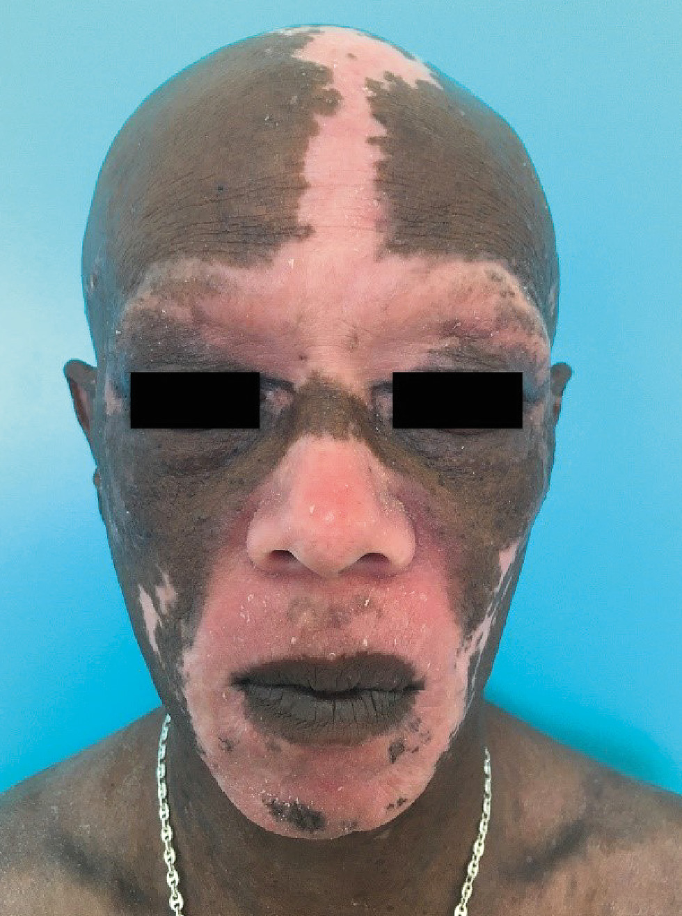 Мужчина, 46 лет, в течение года страдающий витилиго, проявляющимся медифациальной депигментацией и десквамацией. У больного наблюдались очаговая алопеция, ассоциированная с ангидрозом; сопровождаемый зудом ксероз туловища, а также высыпания на лобке в виде папул. Выявлена ладонно-подошвенная кератодермия с множественной пахионихией и онихолизом. При патоморфологическом исследовании обнаружены гранулематозные поражения с пилотропизмом, сиринготропизмом и васкулитом, в результате чего выставлен диагноз пилотропной гранулематозной кожной Т-клеточной лимфомы.