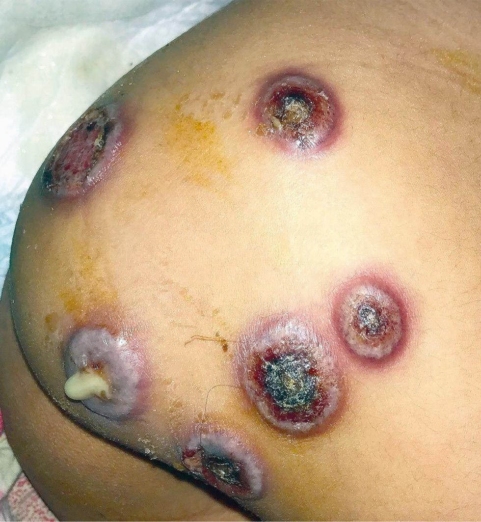 Рис. 3. Множественные некротические язвы у ребёнка: гангренозная пиодермия. (3-е место; Dr Hind Taoufik, Марокко). / Fig. 3. Ulcères nécrotiques multiples de l’enfant: Pyoderma Gangrenosum. (3rd place; Dr Hind Taoufik, Maroc).
