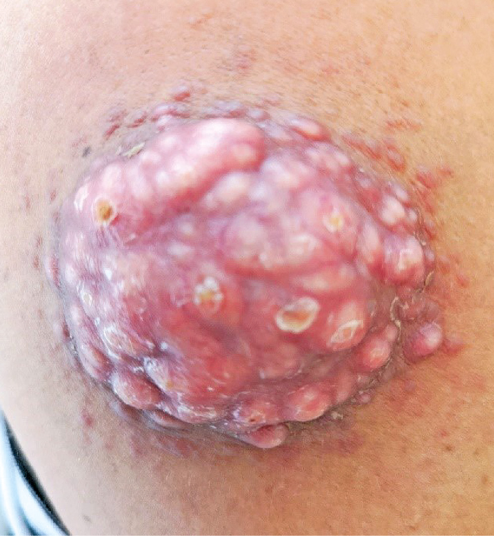 Деревенская жительница, 32 года, без сопутствующих патологий. Обратилась за консультацией по поводу новообразования на правой руке, резко, без субъективных ощущений увеличивающегося в размерах в течение 2 мес. При осмотре: опухоль диаметром 4,5 см, состоящая из множественных узелков, полупрозрачная, желтоватая, с телеангиэктазиями на поверхности, твёрдоэластичной консистенции, безболезненная и подвижная при пальпации. Гистопатологическое исследование выявило истончение эпидермиса, потерю сетчатых гребней, гигантские клетки Тутона в дерме. На основании проведённой диагностики верифицирована ювенильная ксантогранулёма.