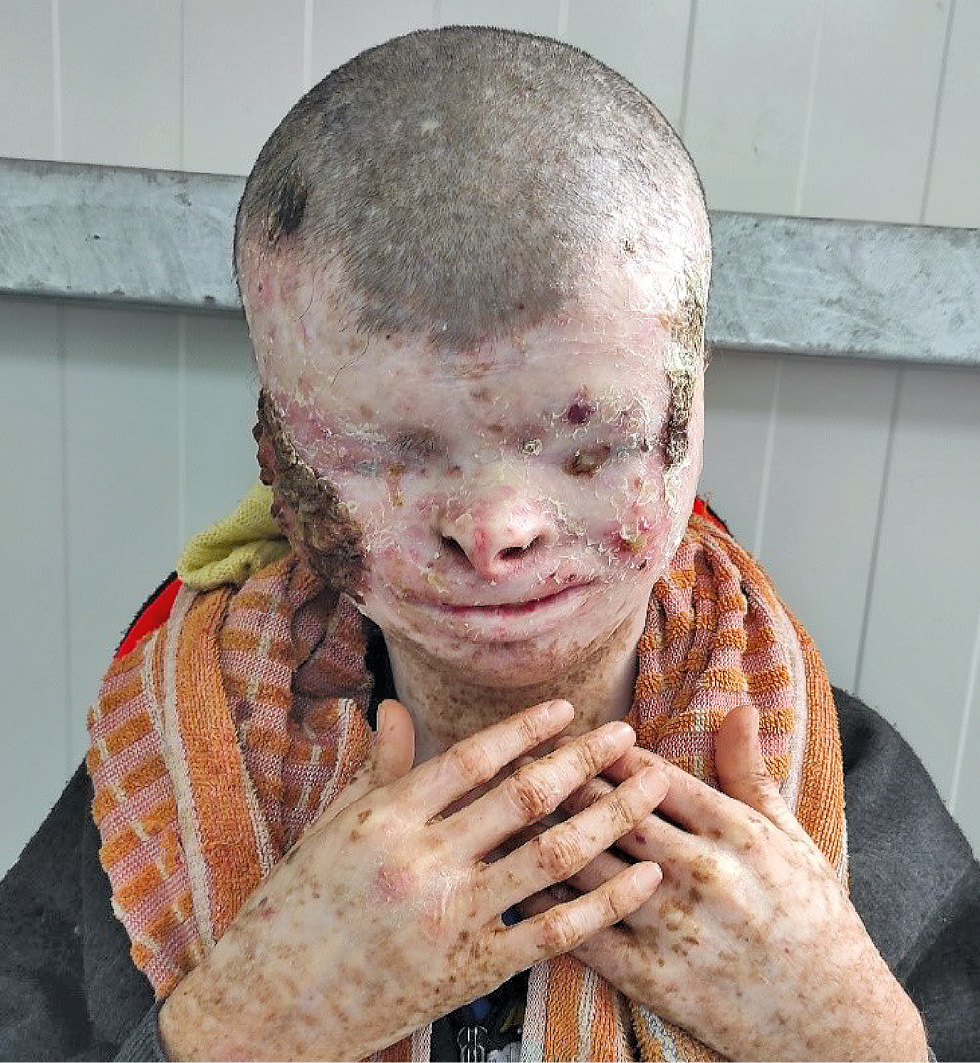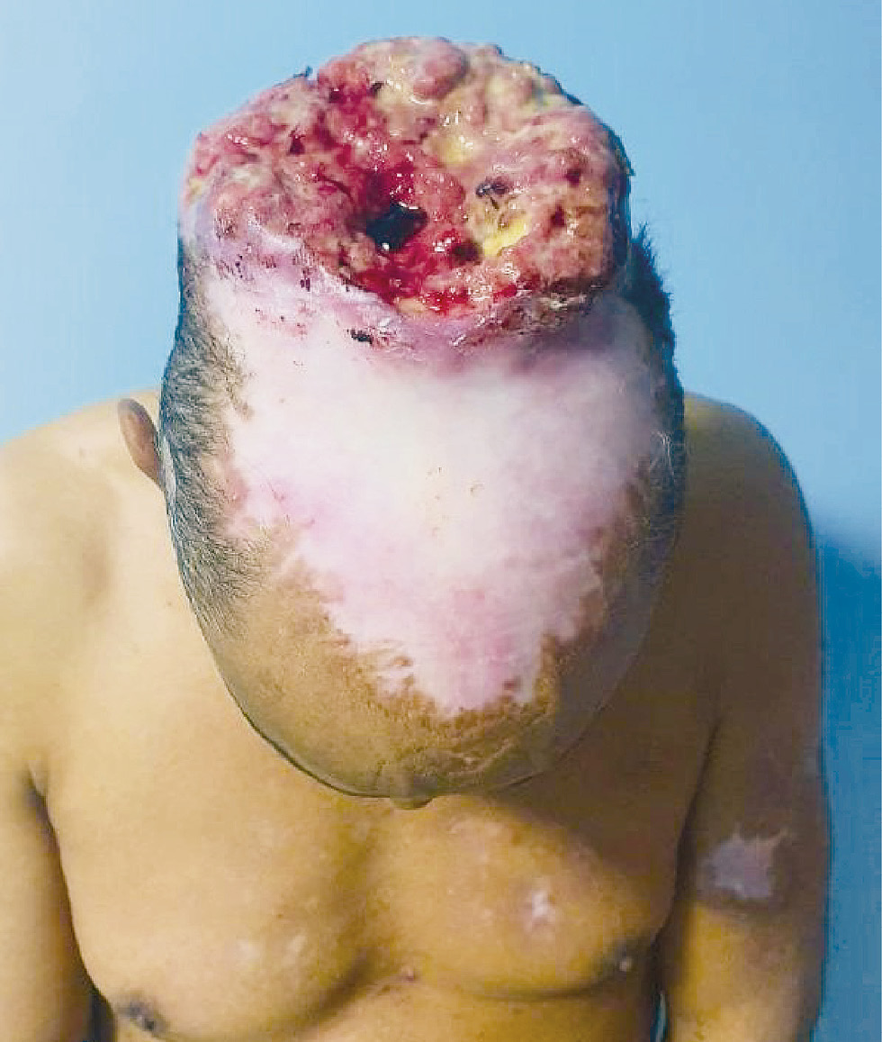 Рис. 8. Гигантский плоскоклеточный рак, развившийся на месте рубца на фоне хронической волчанки. (Dr Hajar Douma, Марокко). / Fig. 8. Carcinome épidermoide géant sur cicatrice de lupus chronique. (Dr Hajar Douma, Maroc).