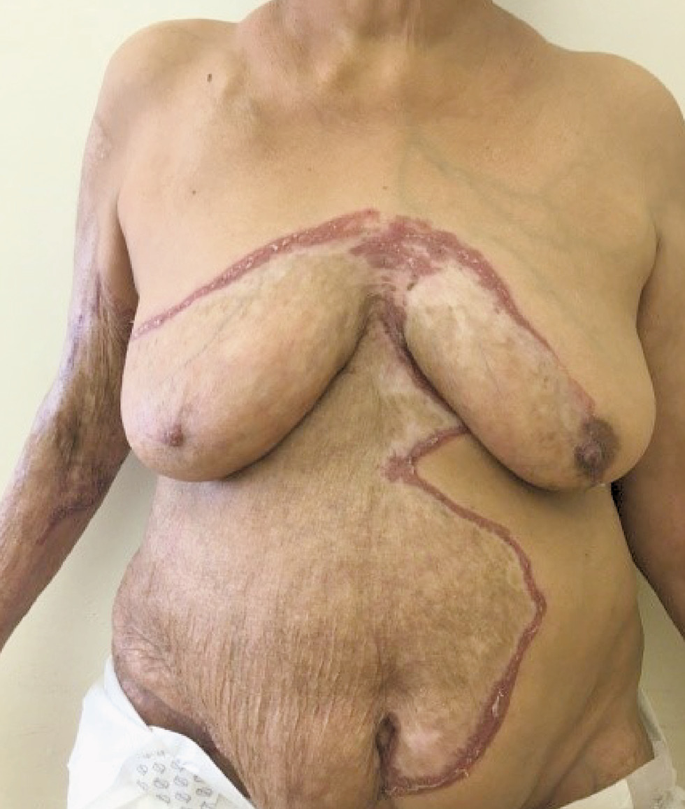 Рис. 7. Линейные эритематозно-сквамозные высыпания на туловище. (Dr Lisa Delorme, Франция). / Fig. 7. Lésions érythémateuses squameuses linéaires du tronc. (Dr Lisa Delorme, France).