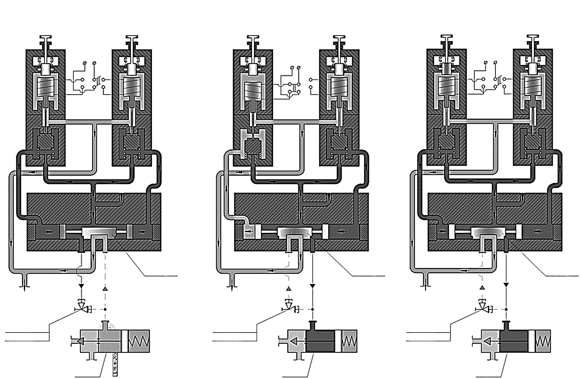 При подаче напряжения на катушку, якорь, притягиваясь к стопу, действует через шток на золотник 1 и перемещает его в нижнее крайнее положение. Воздух перемещает золотник 3 в правое крайнее положение и проходит через штуцер «2» в пневмопривод. Одновременно воздух поступает на поршень, который перемещает золотник 2 в левое крайнее положение и перекрывает доступ воздуха в штуцер «1». При этом воздух из пневмопривода, соединенного со штуцером «1», сбрасывает через штуцер «С».