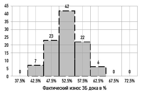 Рис. 3. Гистограмма распределения износа дока в %.