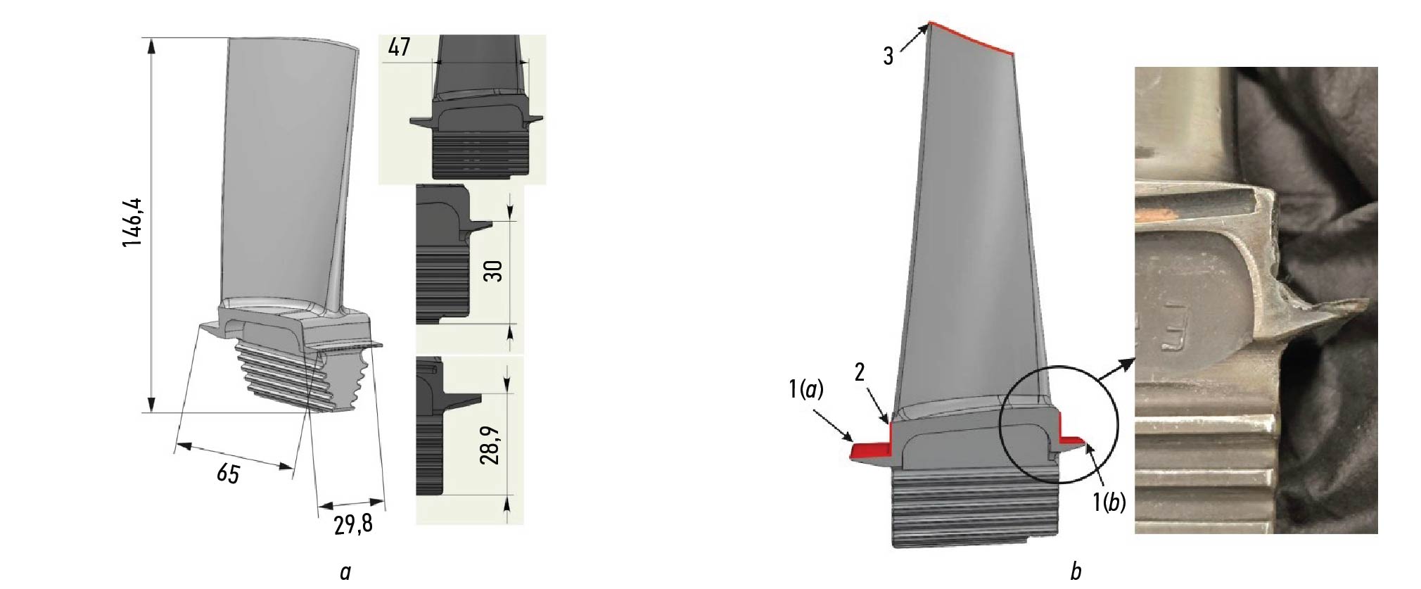 Для оценки износа рабочих лопаток турбины высокого давления был проведен измерительный контроль поверхностей, которые подвергаются износу, с последующим сравнением размеров 3D-модели рабочей лопатки в программном обеспечении SolidWorks 2020. Размеры рабочей лопатки приведены на рис. 1, a в миллиметрах. Сравнив полученные результаты измерений с исходной 3D-моделью рабочей лопатки, было выявлено, что износу подверглись: торцы замка (рис. 1, a, b), уплотнительные гребешки (2), а также перо (3), как указано на рис. 1, b в виде красных областей.